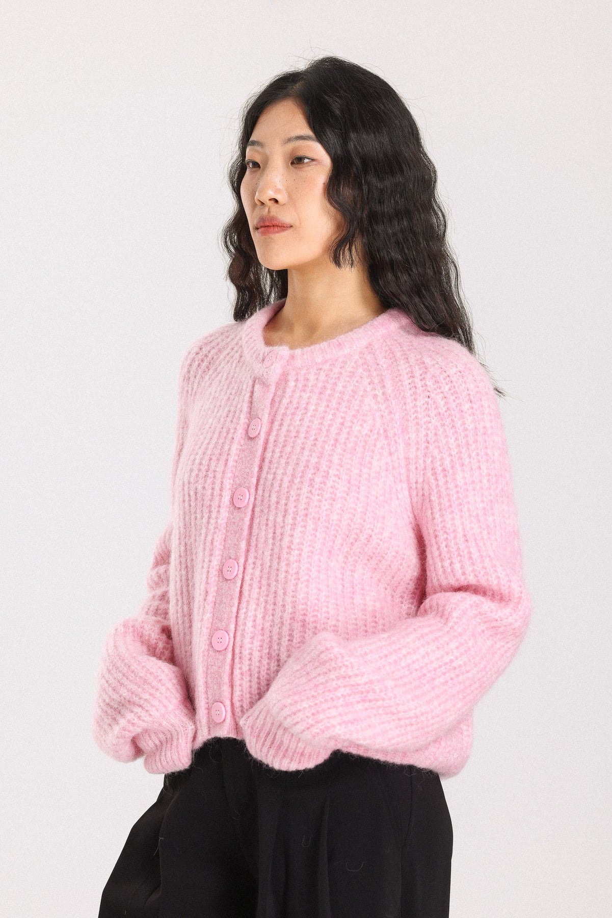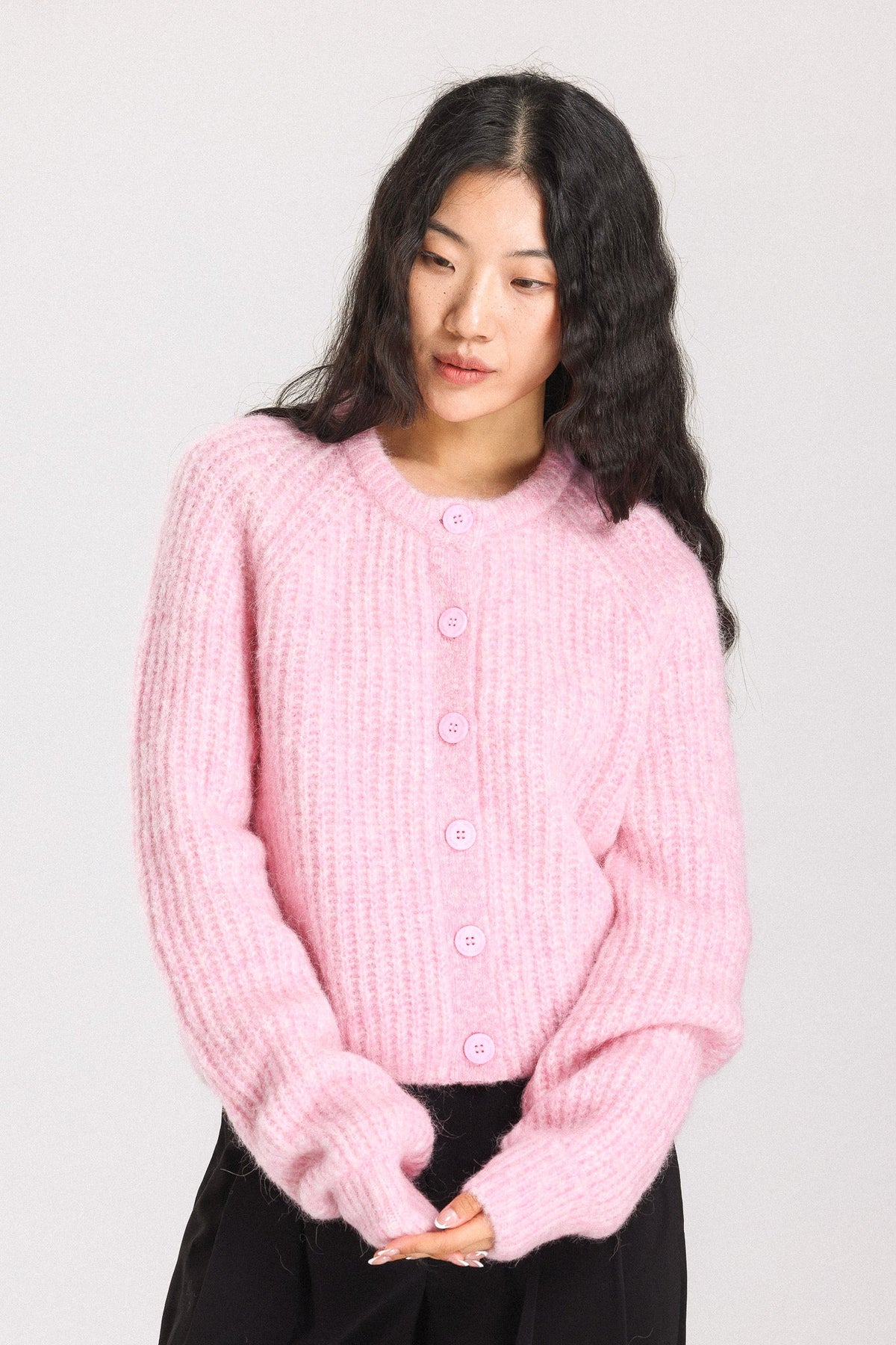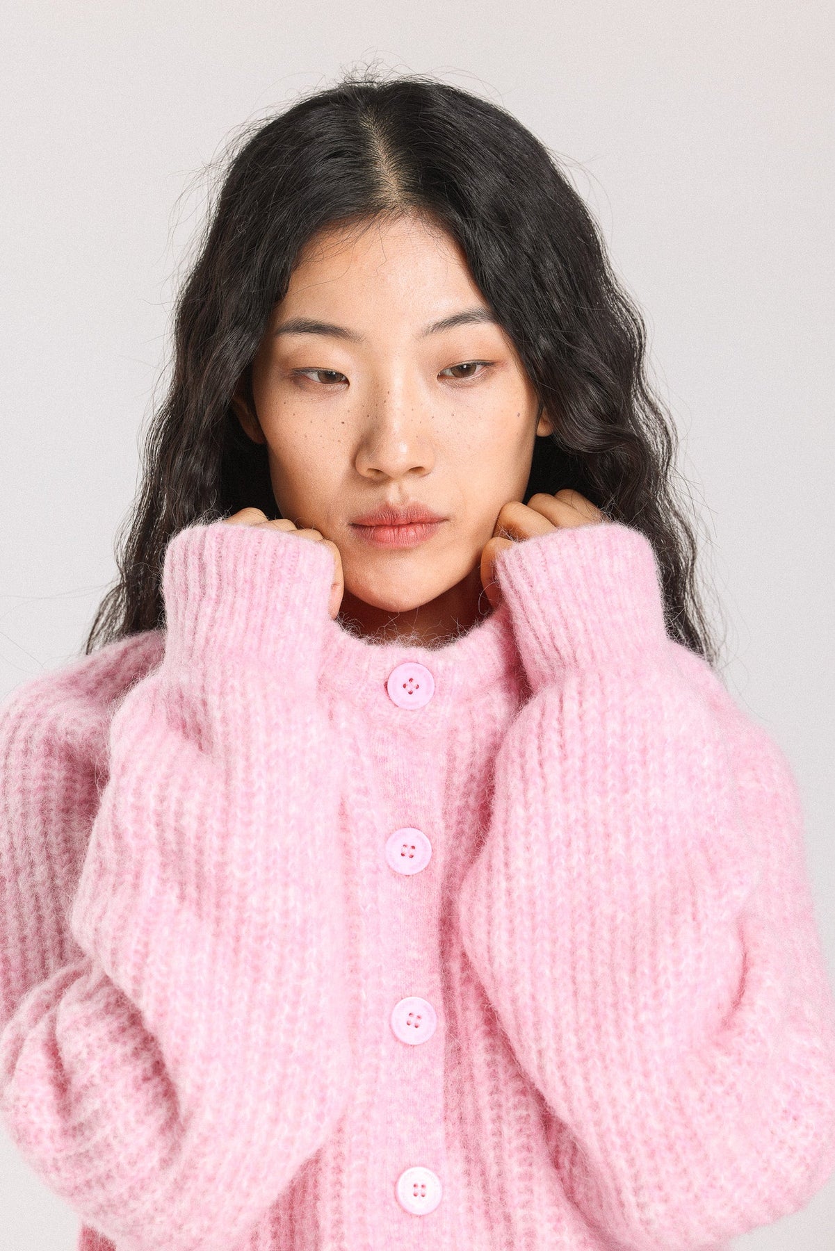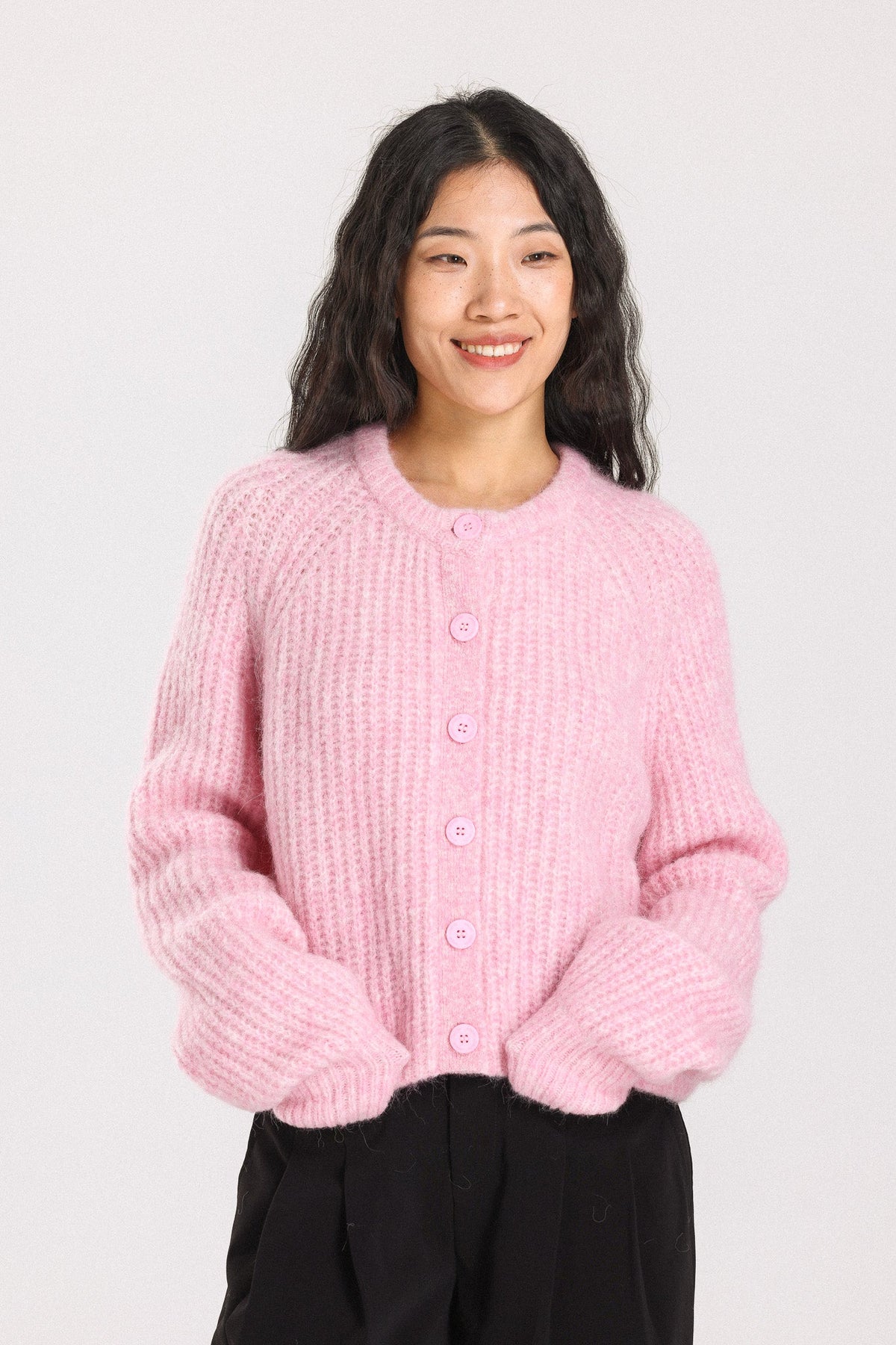 This delightful pink cardigan adds a pop of colour to your wardrobe with a sweet, button-down front and a classic round neckline, perfect for layering.