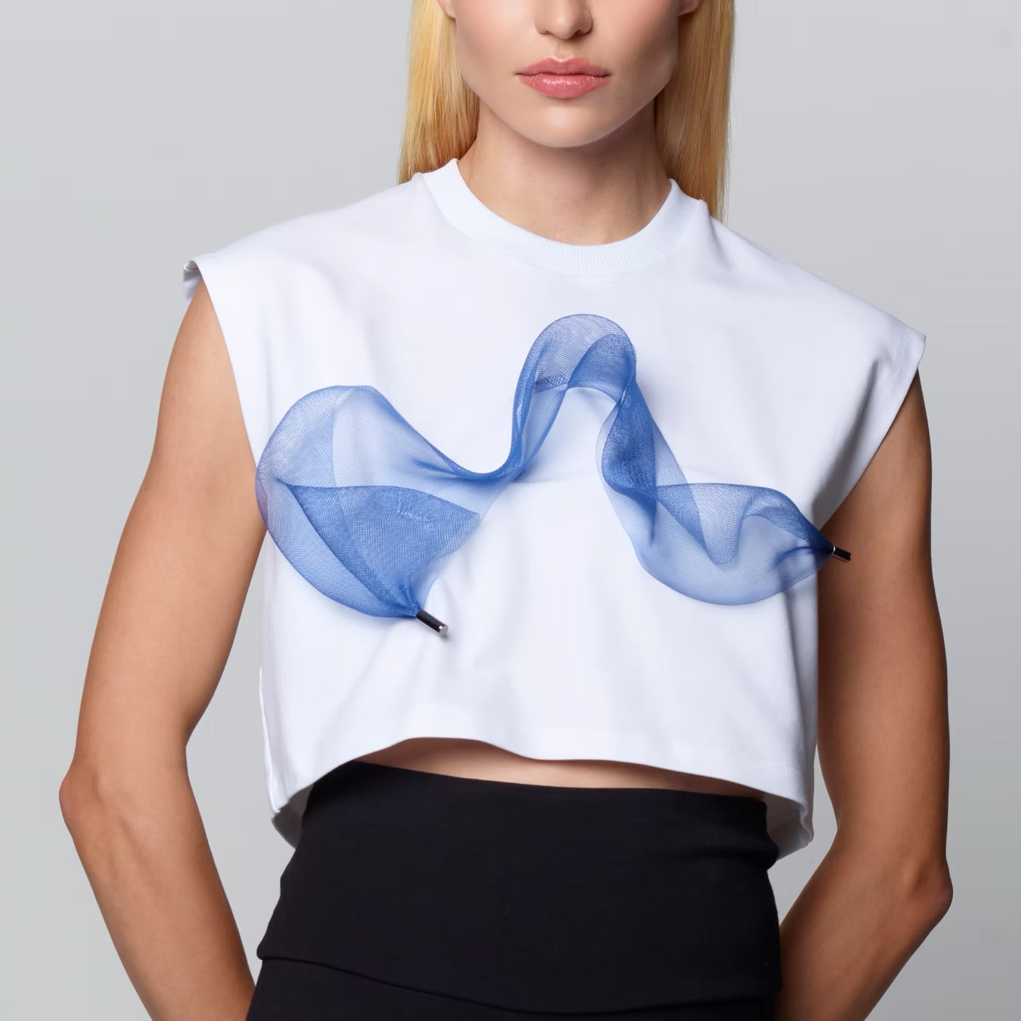 A blue sculptural wave sweeps across the front, creating a striking modern statement for those who appreciate wearable art.