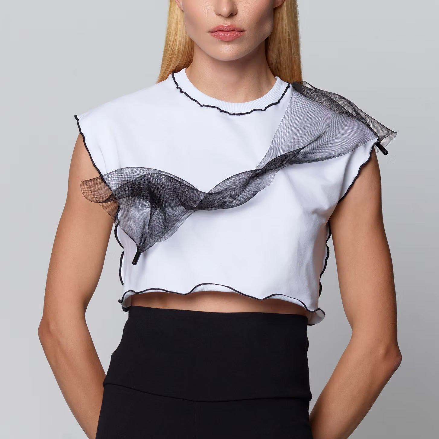 A sculptural wave sweeps across the front, creating a striking modern statement for those who appreciate wearable art.