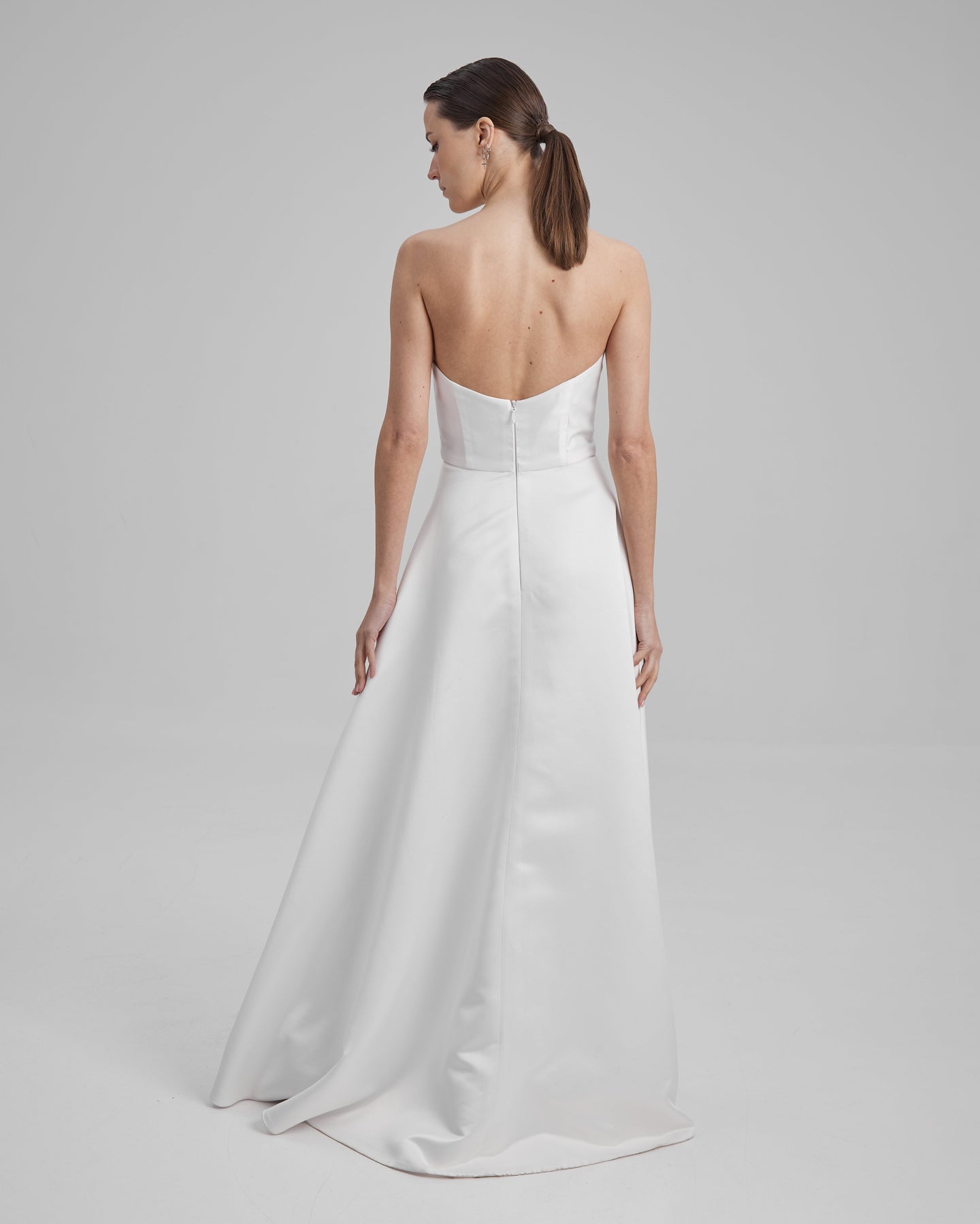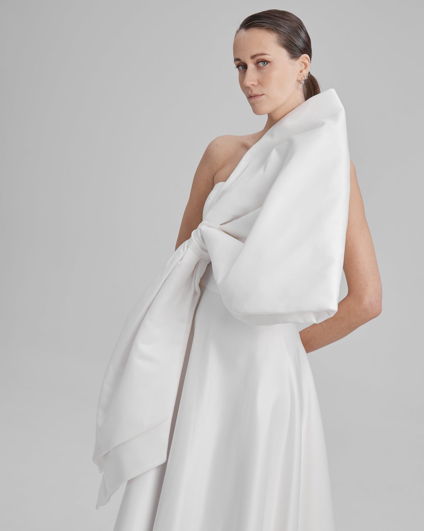 Experience the essence of romance with our captivating Eve A-line dress, meticulously crafted from luxurious Mikado fabric. Eve is designed to captivate hearts at city weddings, registry office ceremonies, rehearsal dinners, or intimate elopements. The corseted straight neckline of the dress exudes timeless charm and classic elegance, creating a beautifully structured silhouette that accentuates your natural grace.
