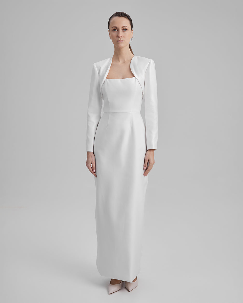 Introducing our breath-taking column silhouette dress, meticulously crafted from luxurious Mikado fabric, designed to elevate your style for city weddings or any special occasion.