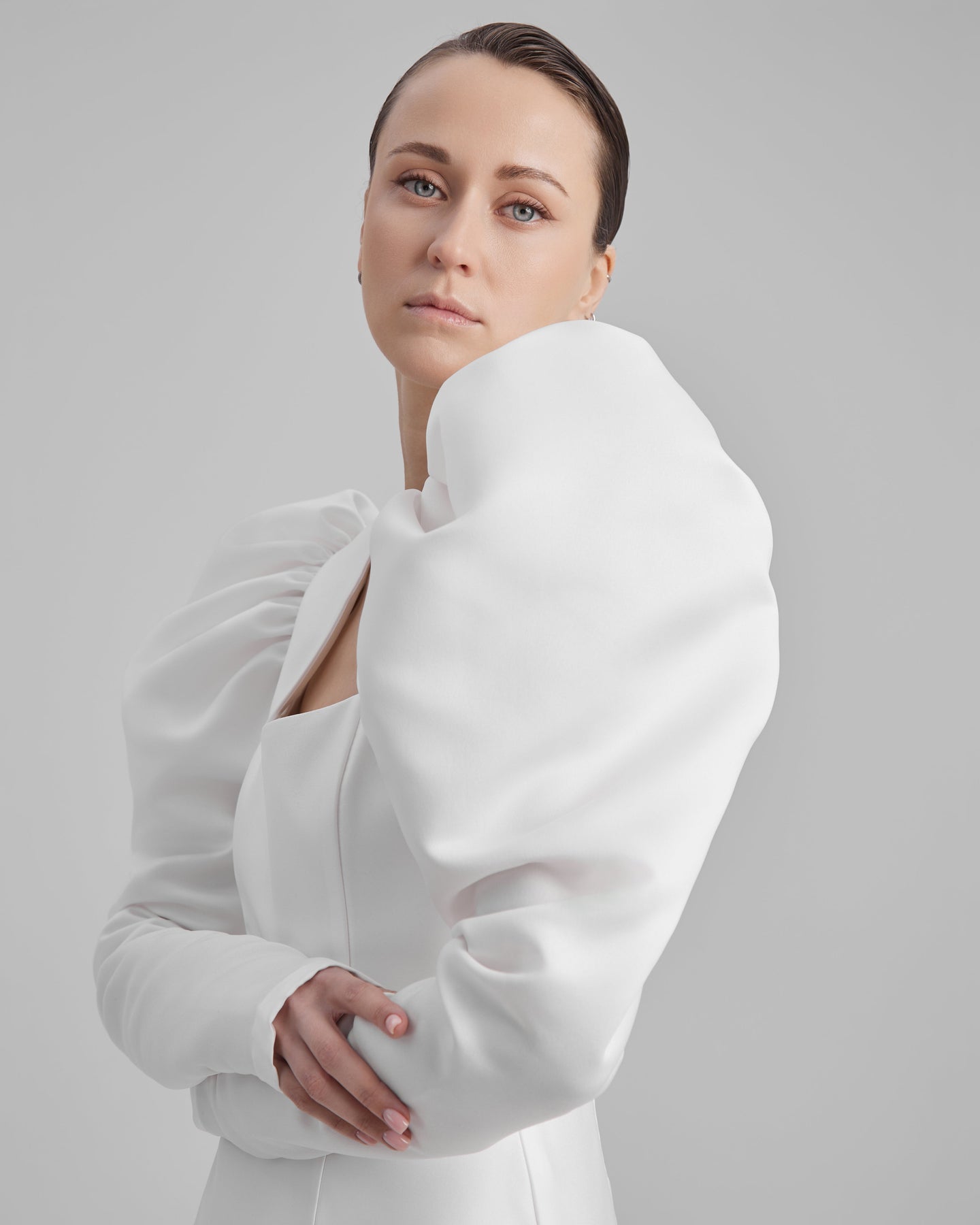 IDA DRESS + PUFFED SLEEVE BOLERO | square neckline pencil maxi in white
