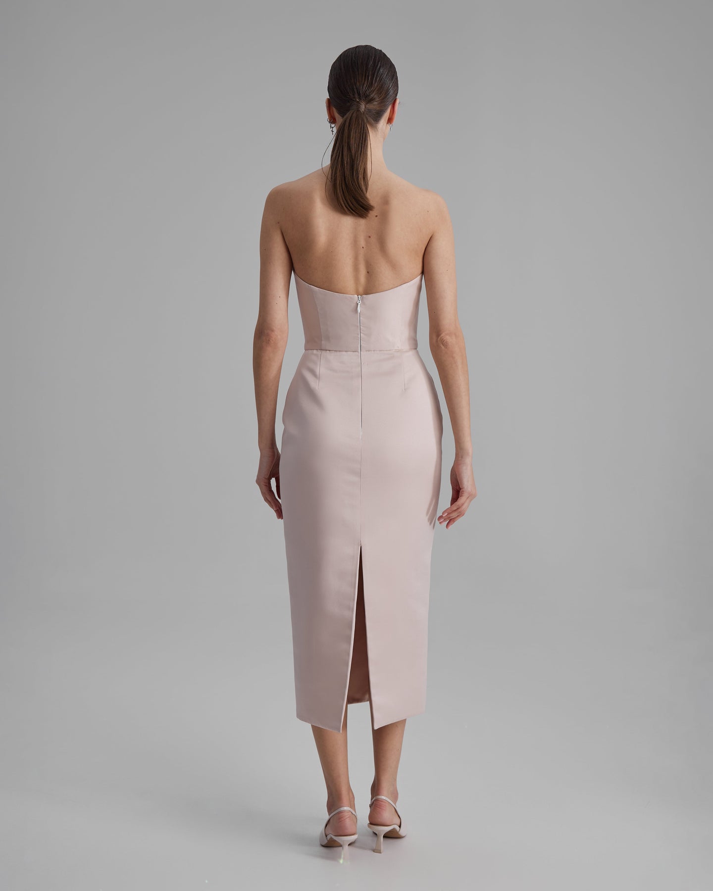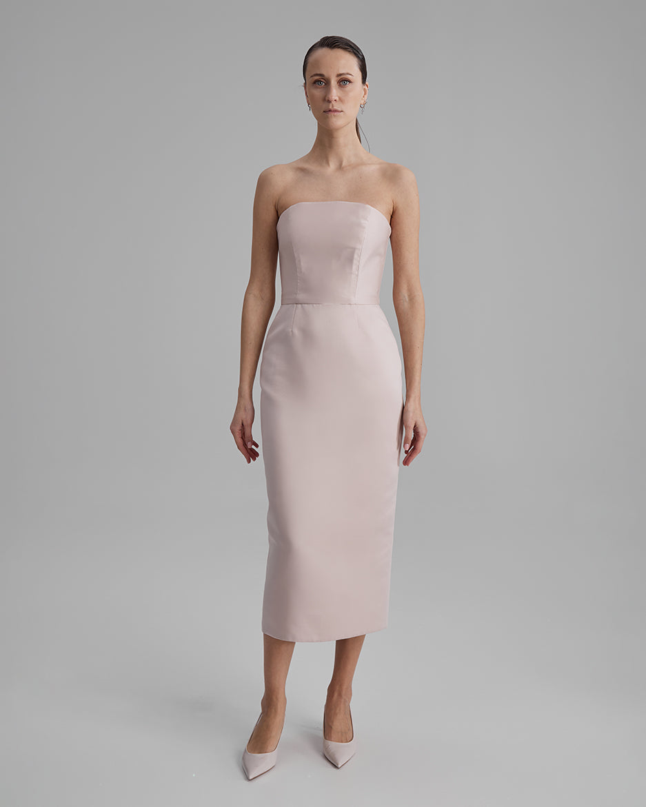 KIRA DRESS | strapless pencil midi in apricot pink