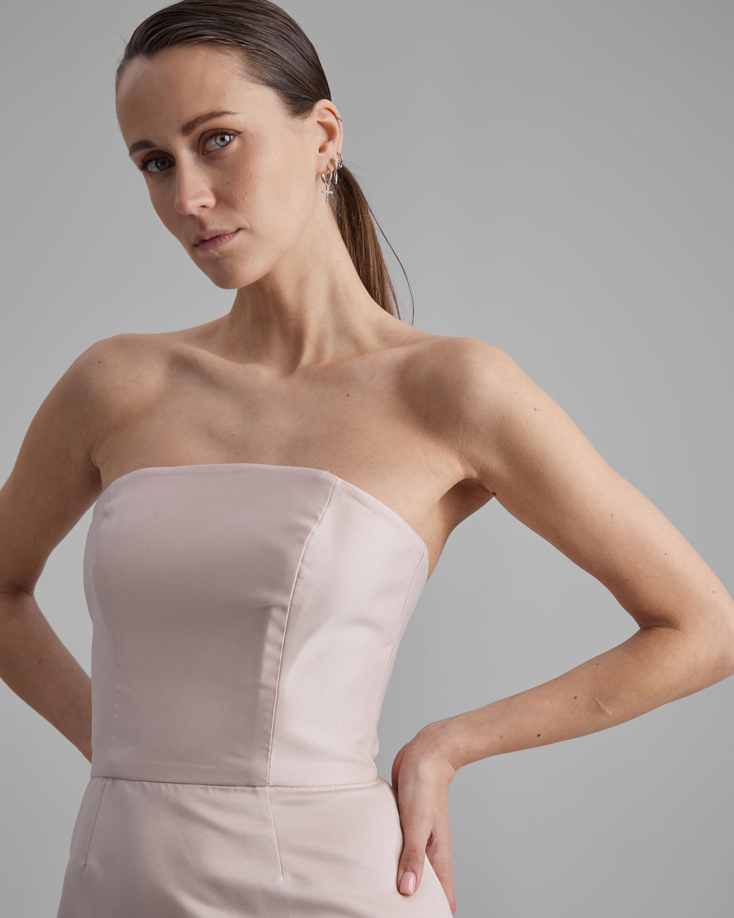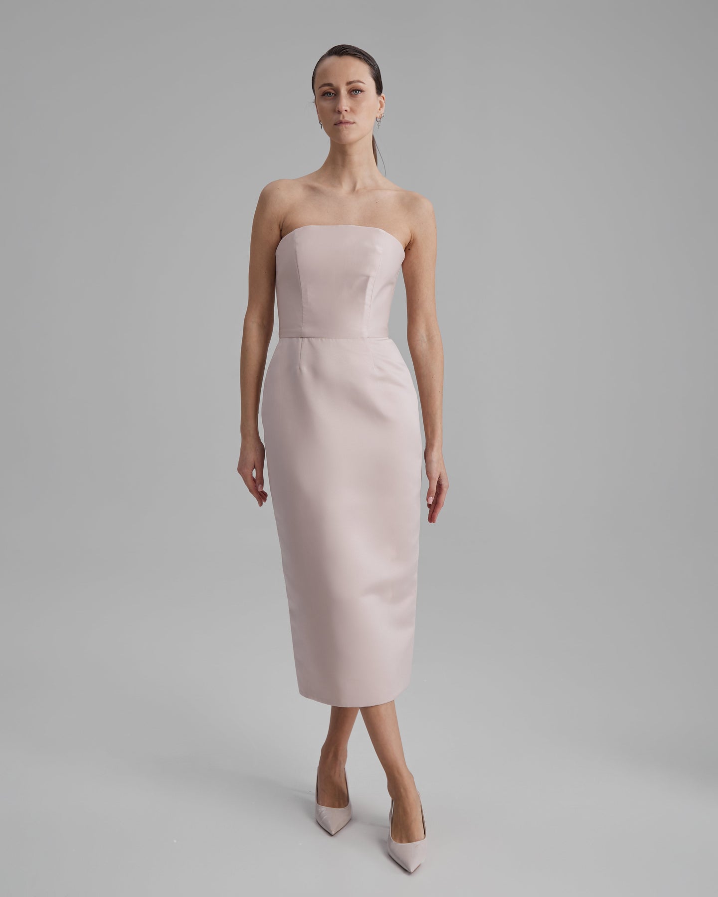 Experience the essence of minimalism and contemporary elegance with our Kira fitted dress in a stunning nude colour. The strapless neckline accentuates your natural grace, while the luxurious Mikado fabric lends a timeless allure.