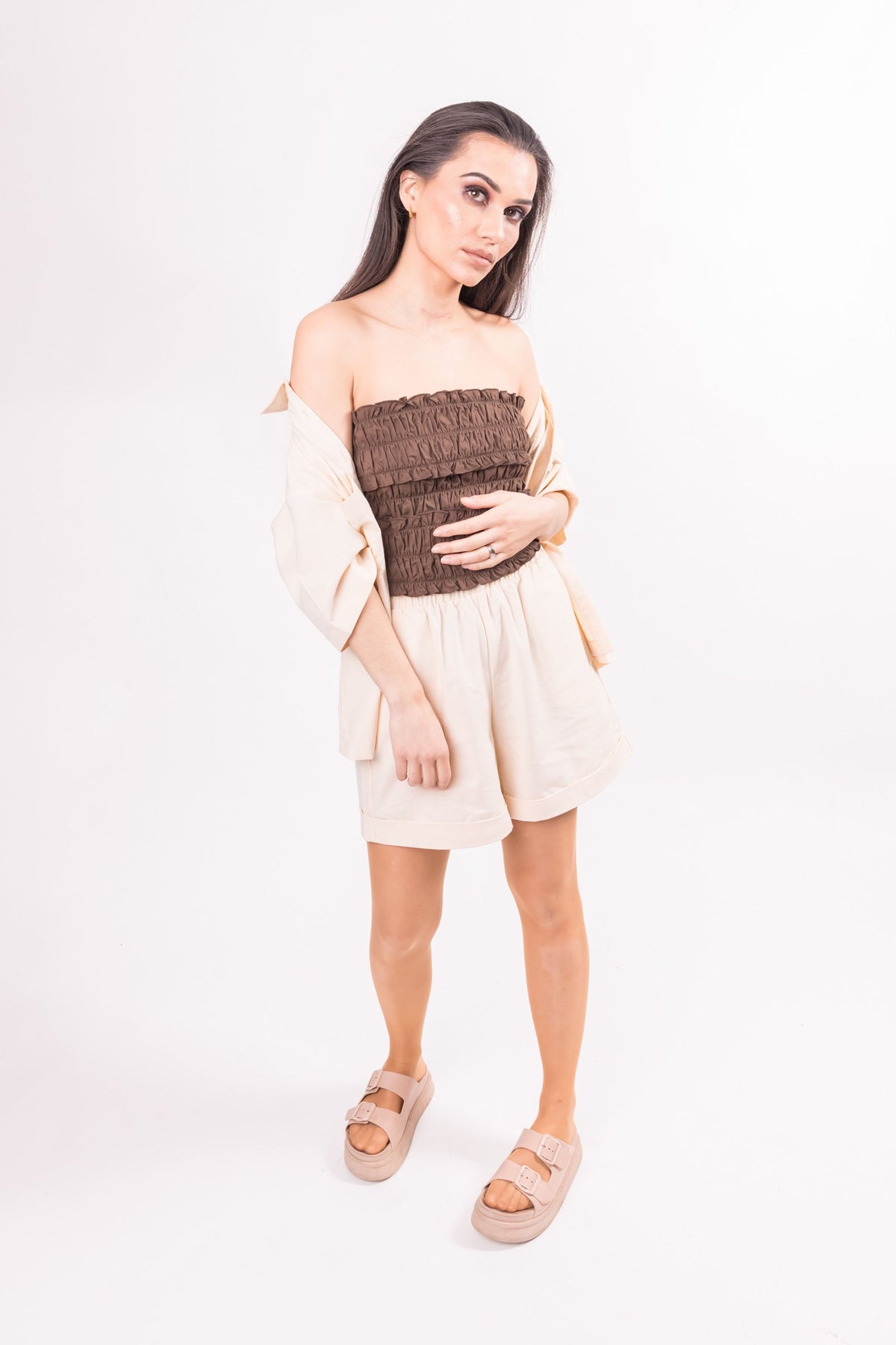The shirring top is strapless, elasticated and is available in 3 colours. The top is great for all occasions, and is great worn on its own or layered on top of a shirt