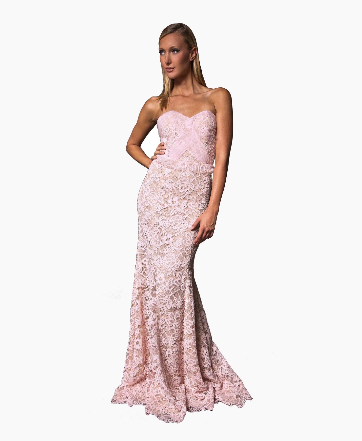 The Alli dress is a blush lace gown with tulle and organza embelishments. This dress features a strapless look, frilly waist details and is designed to be fitted from bust to hips and flare at mid thigh. This dress creates a delicate and beautiful look.