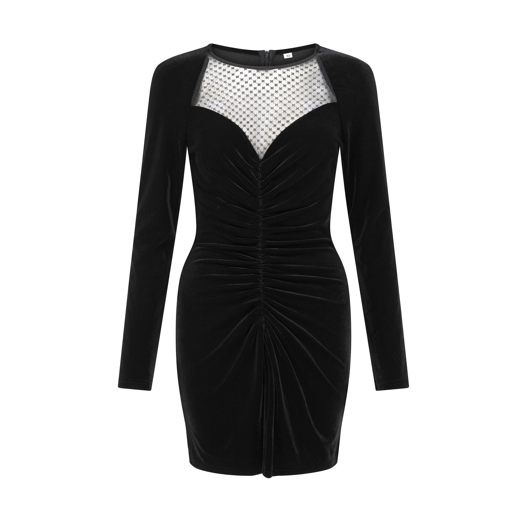 You can always count on SOUR FIGS for the perfect LBD. This black velvet mini dress with a sheer mesh panel is just ultra glamorous. It features slightly stretchy fabric, velvet finish, mesh paneling, ruched detailing, V-neck, and slim cut. Style it with sheer tights and metallic accessories.