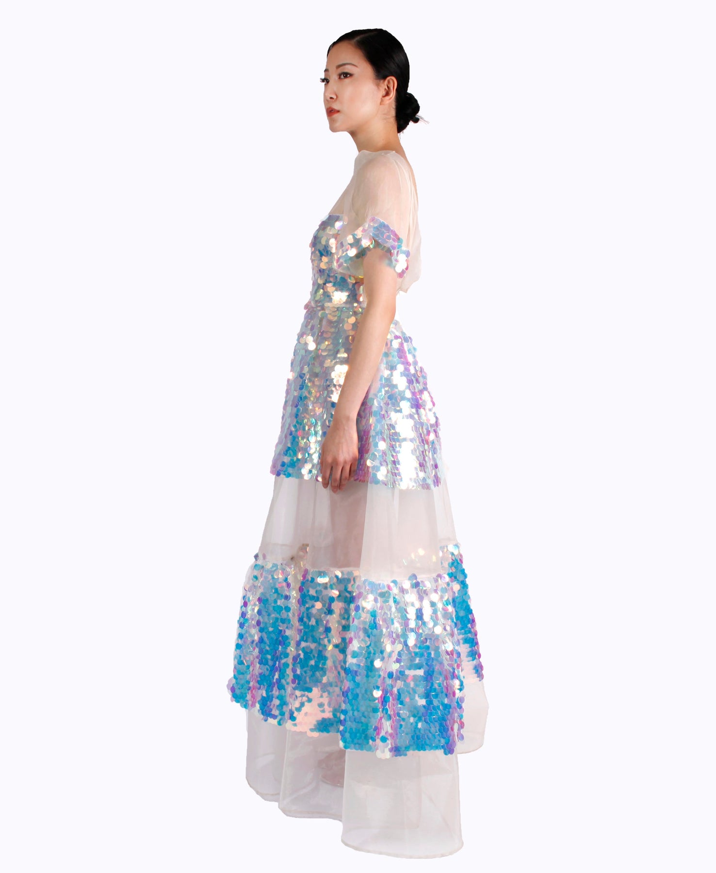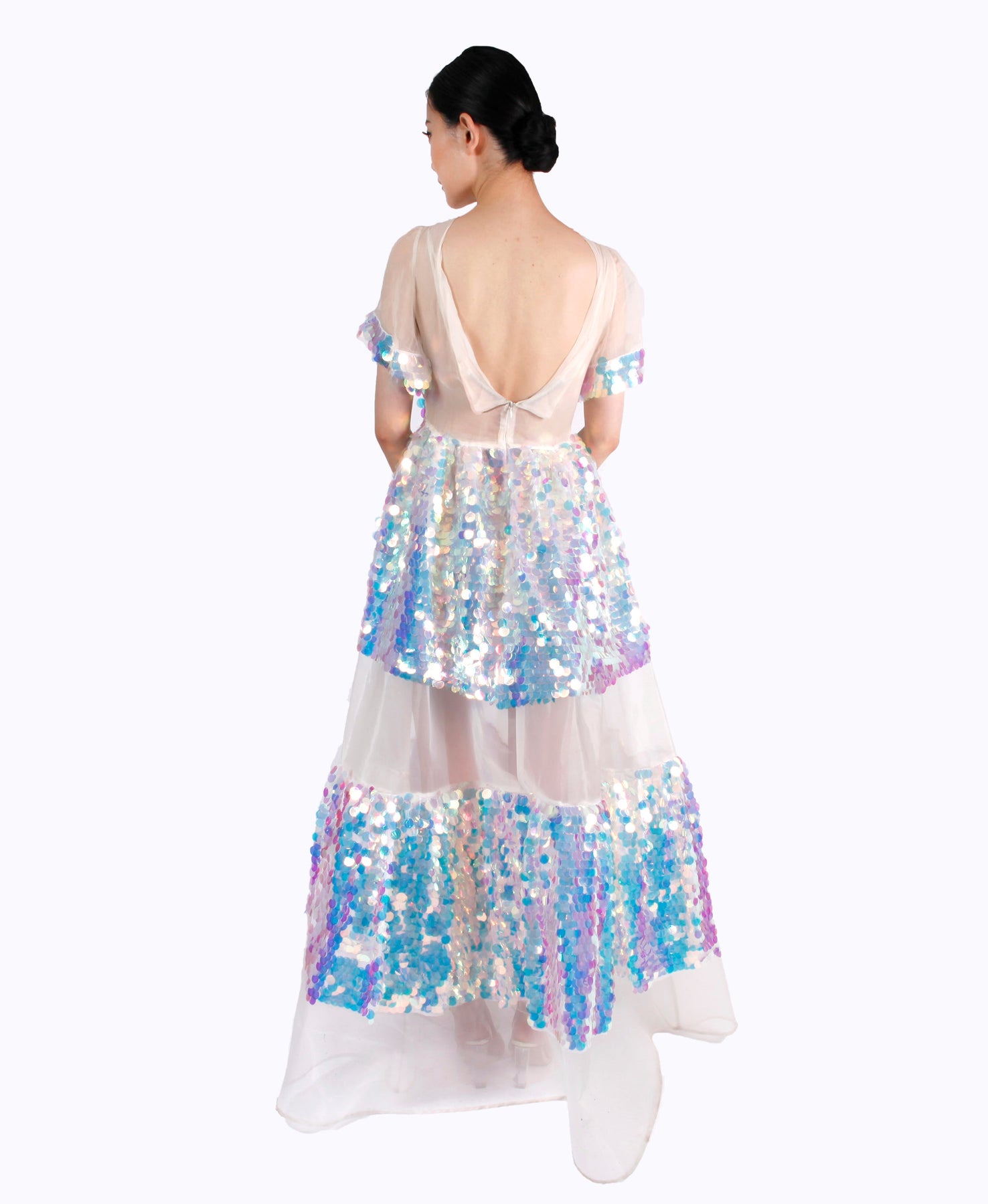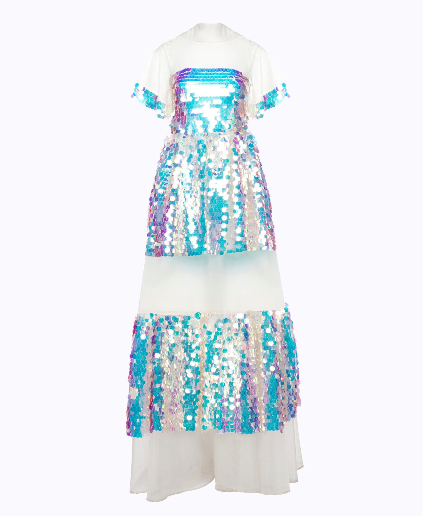 Sheer gown with jumbo irridescent sequin on structured invisible mesh Prepare to dazzle in this iridescent dress as the sequins catch light and look like something out of a dream. The high neck and low back are balanced by a full skirt that shows some leg though tiers of sequin and organza. The flared sleeves are decorated with sequins around the hem adding that extra bit of sparkle. Fit & Features