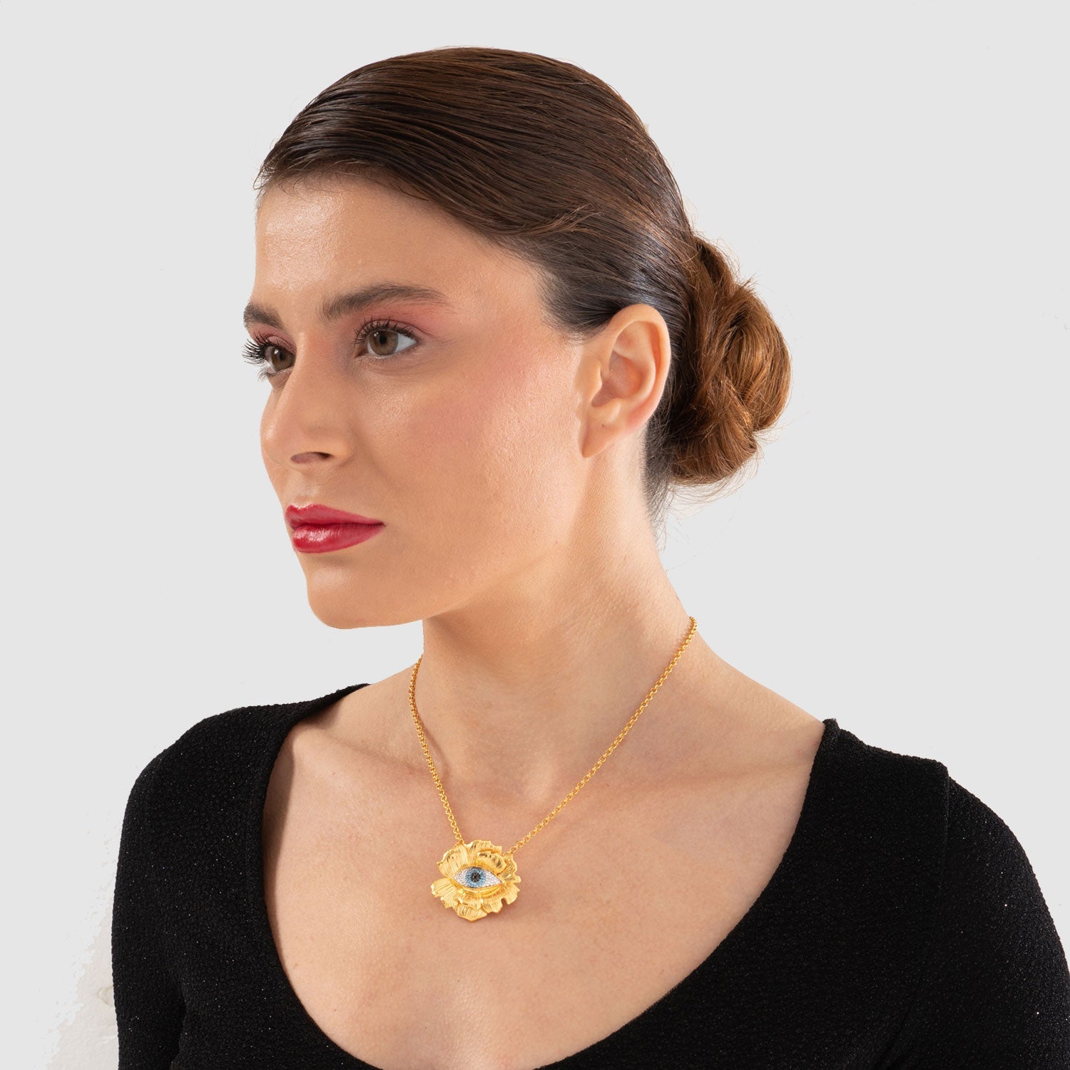 Introducing the mesmerizing Evil Eye Flower Necklace, a striking fusion of surrealism and contemporary design.