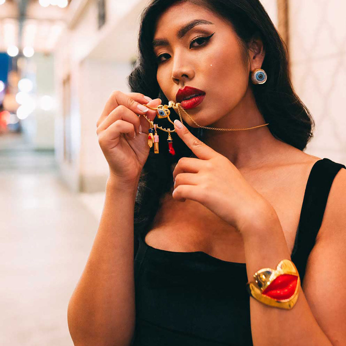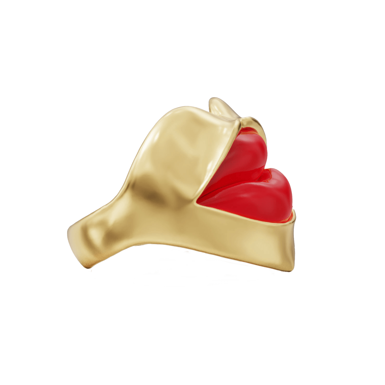 A true masterpiece of pop-art and surrealism-inspired design. This exquisite jewelry piece combines the timeless elegance of gold with a daring contemporary twist.