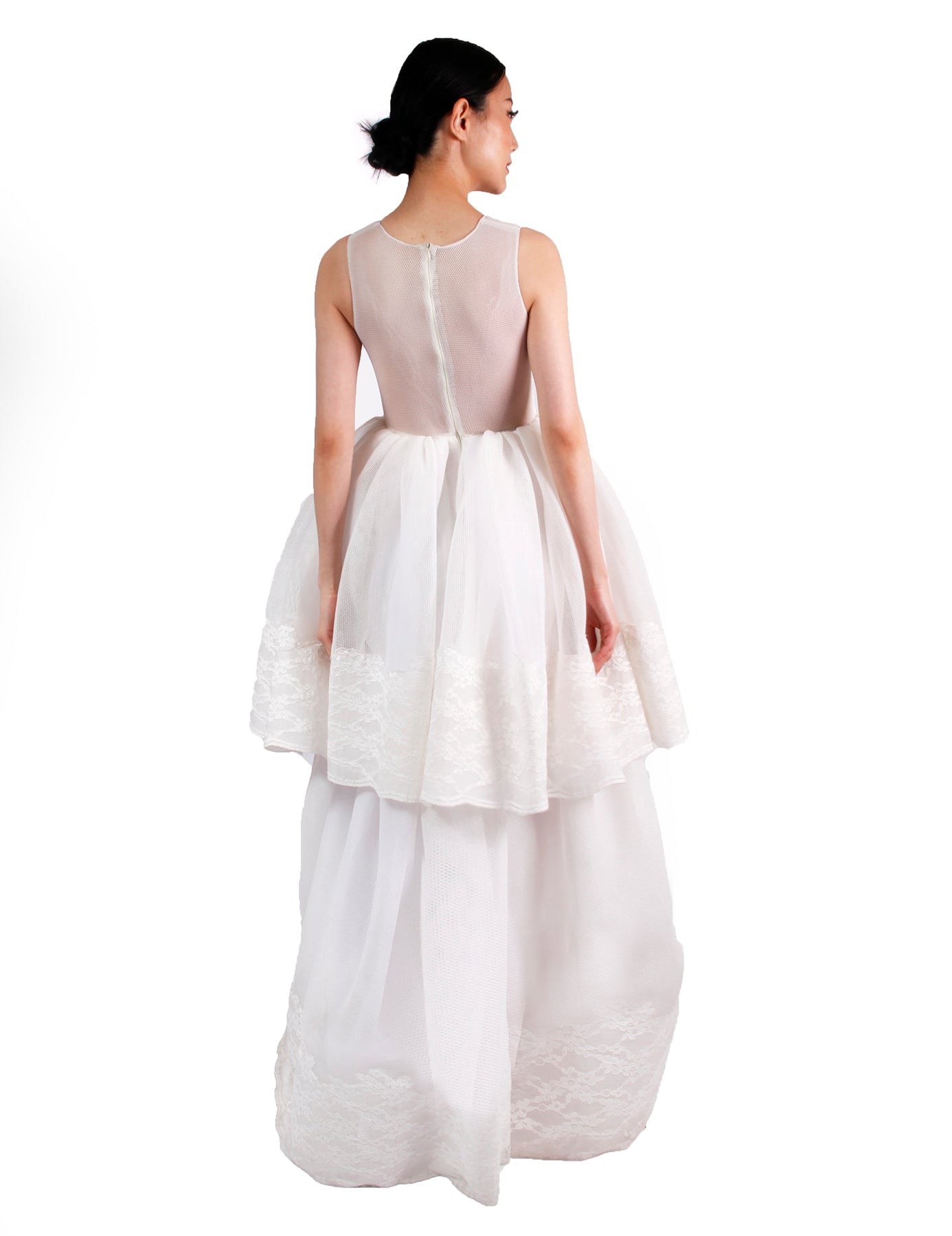 In the 1950s, tiered dresses were most often luxurious wedding dresses. Moving into the 1960s the style had worked its way into mainstream trends as a more permissive approach towards dressing was adopted. Salla is a two-tiered industrial mesh gown with lace embellishment that has a vintage vibe while still keeping a sprightly and stylish expression.