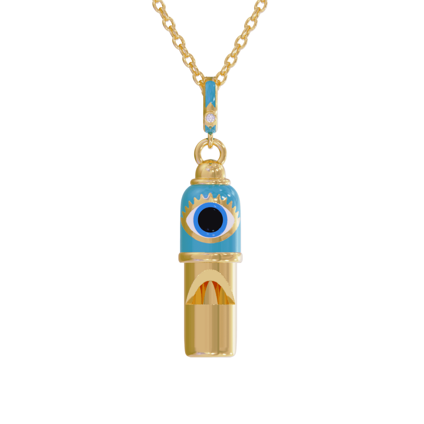 Whistle necklace with a pink and gold pendant featuring an eye design