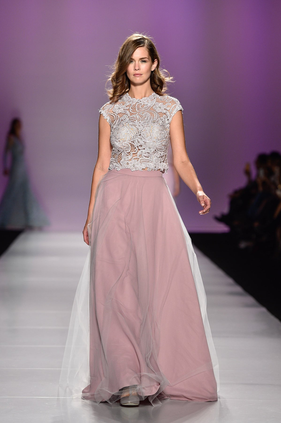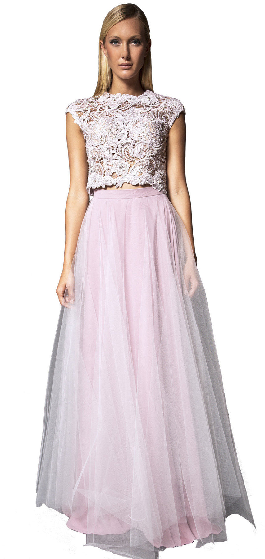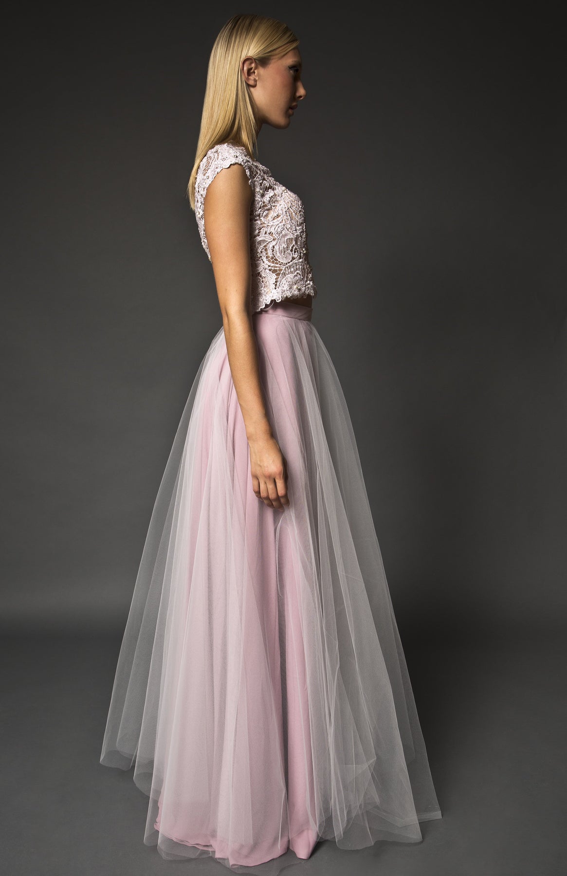 Two piece embellished lace top and floor length tulle skirt