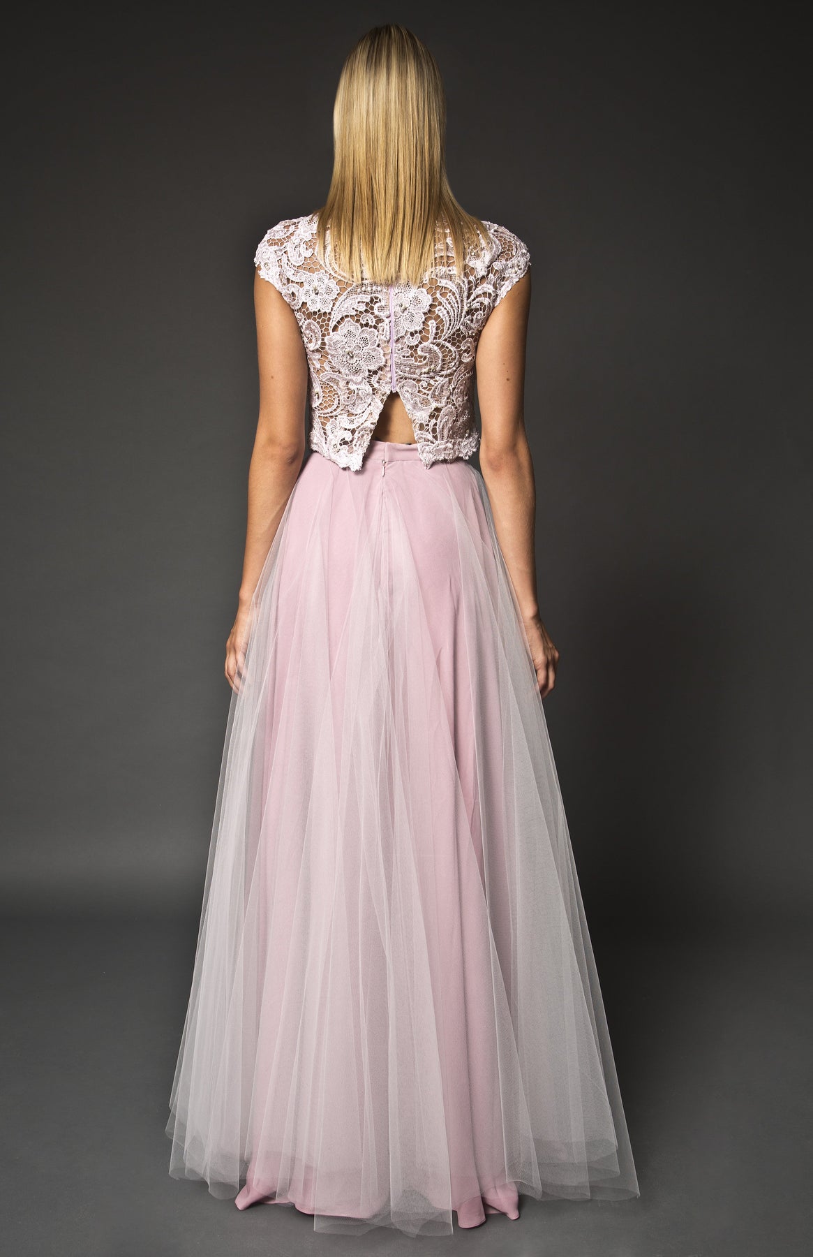 The Ilta dress is a two piece look. The top is lace embelished and the tulle skirt is floor length. The beatiful top features a detailed rounded neckline, short sleeves and a detailed hemline. The skirt designed to be a voluminous flared skirt. These two pieces come together to create an beautiful and unique look.