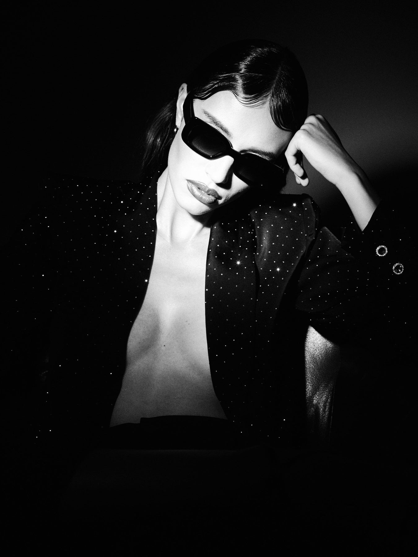 Single-breasted studded blazer with all-over sparkling rhinestones, shawl lapels, diamante button closure, front pockets, long sleeves with padded shoulders. It's a versatile piece that you can wear with our Tailored Suit Trouser for formal events, or style with denim to achieve an elevated casual look, or layer over your favorite little black dress for a special evening out with an added touch of glamour.