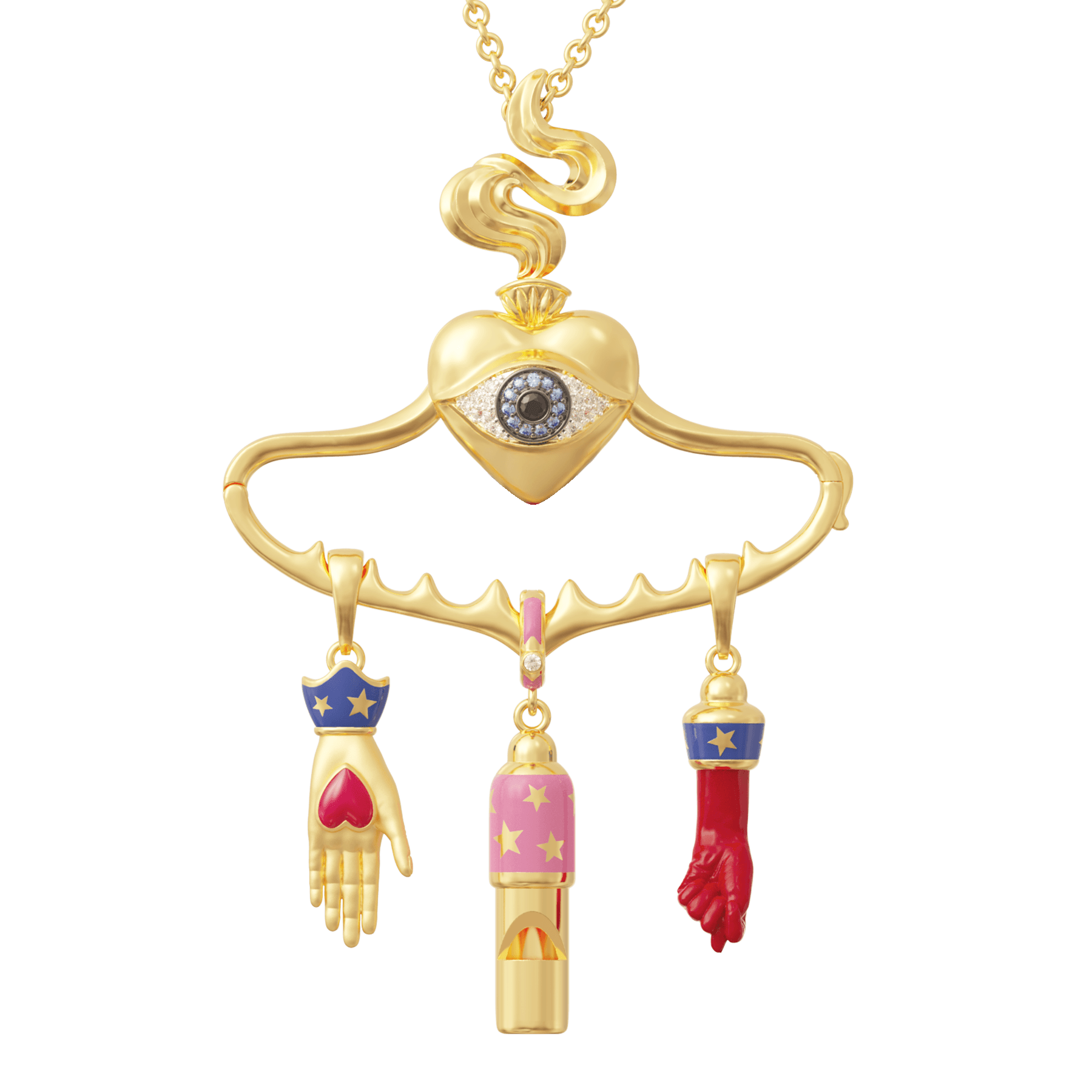 Afro-Brazilian Amulet Rooted in traditions of strength, survival, and cultural exchange, this amulet carries a deep sense of pride and personal meaning. Each charm reflects an individual journey, connecting heritage with contemporary expression. Learn more about Balangandan here. Charms not included Gold vermeil || Rhodium Crystals Dimensions: 60 mm Chain length: 55–63 cm, adjustable Hand-crafted in Istanbul