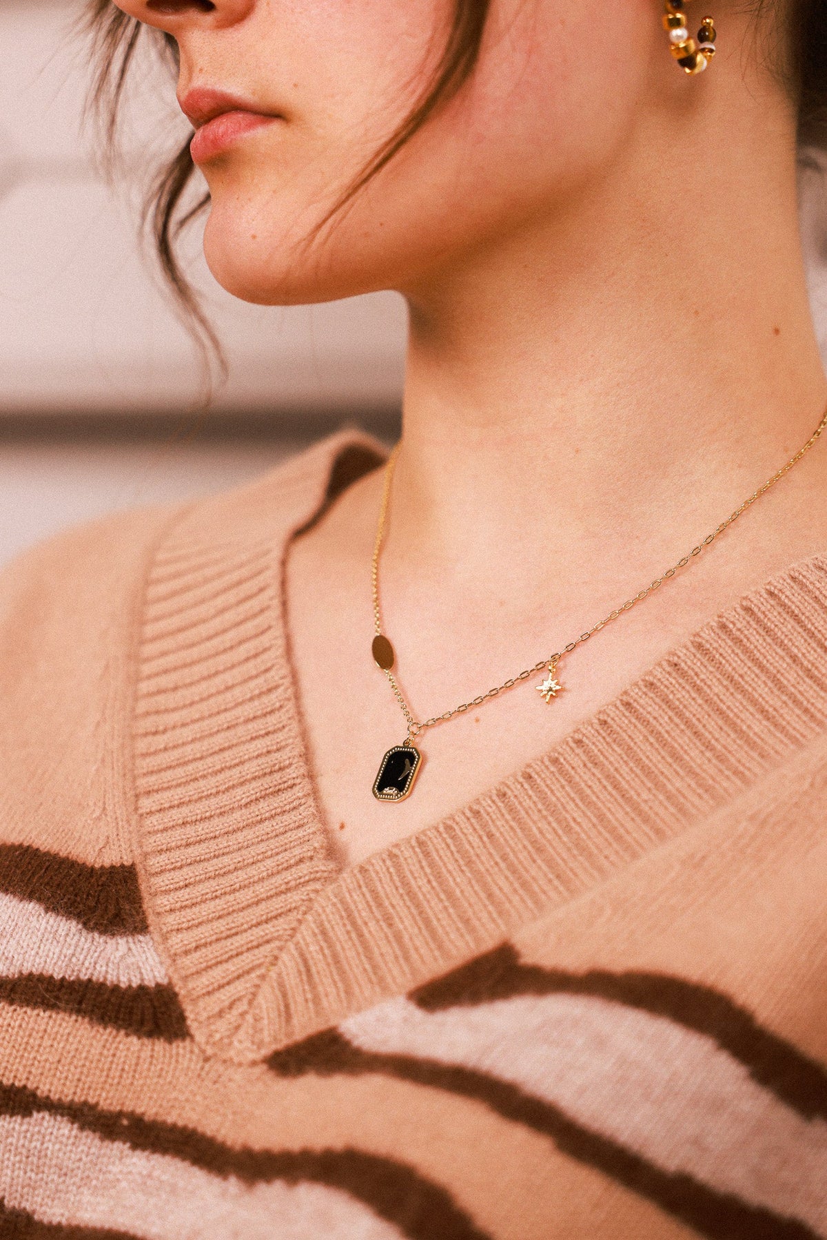 Handcrafted in Italy, this necklace features a stunning black enamel pendant set on an 18K gold-plated recycled brass chain. The delicate star charm and subtle design add an elegant touch, making it a perfect statement piece for layering or wearing alone. Its waterproof design ensures durability for everyday wear.