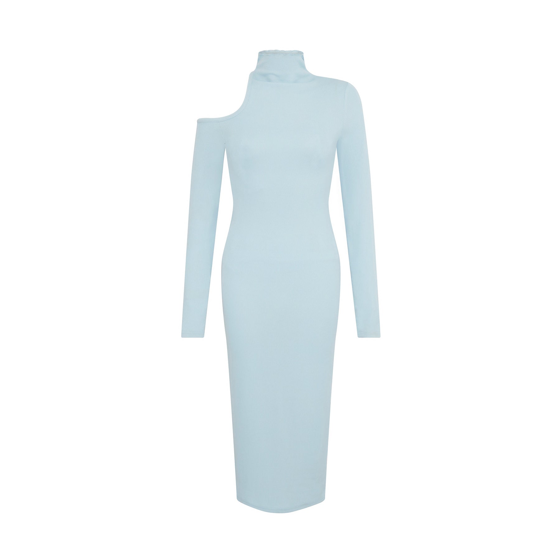 With the asymmetric cut-out detail on the shoulder, this fitted midi dress is alluring and elegant. Made from a lightweight, soft light blue rib knit, this dress features a high neck and long sleeves, closely hugging and accentuating your curves.
