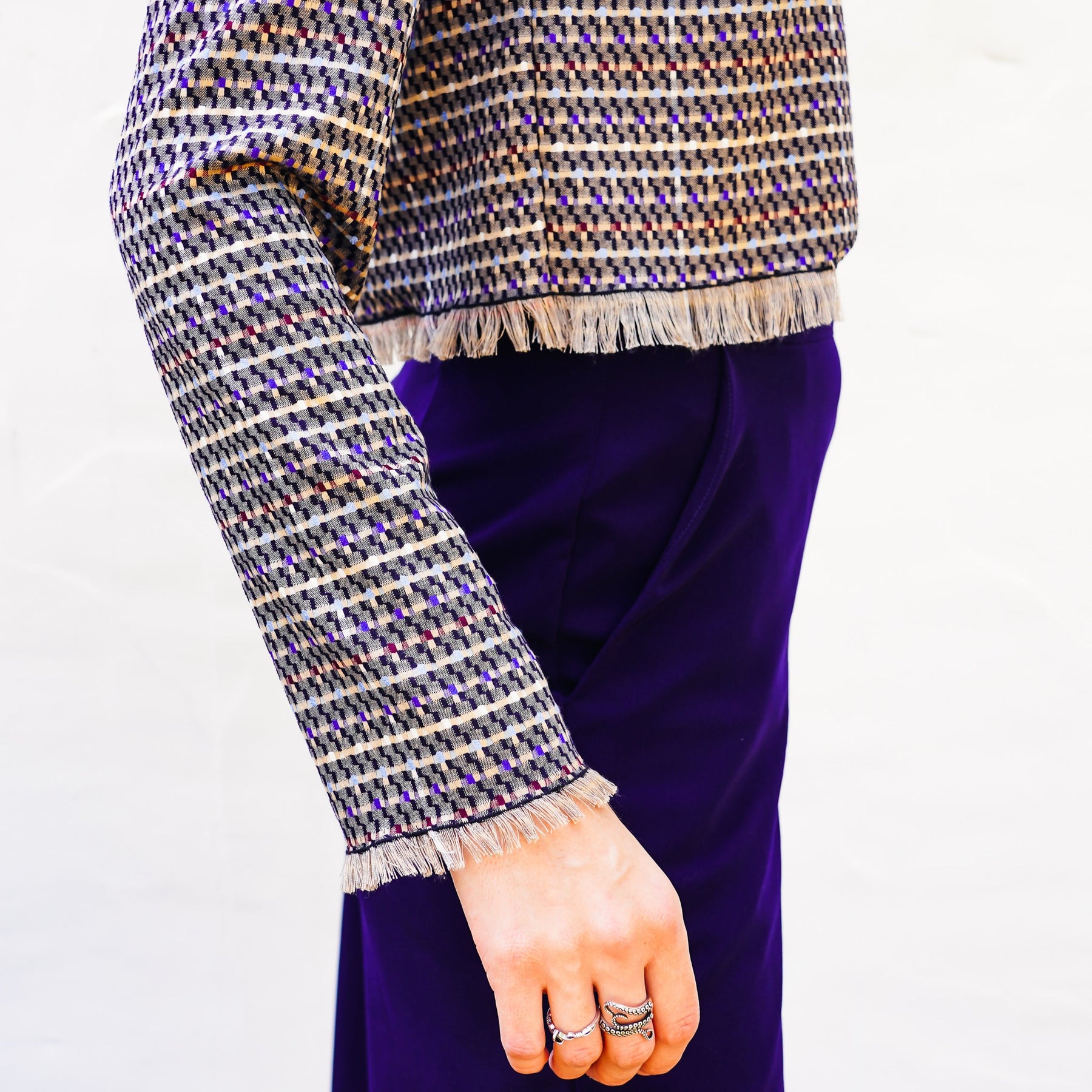 Fringed cuff and hem.