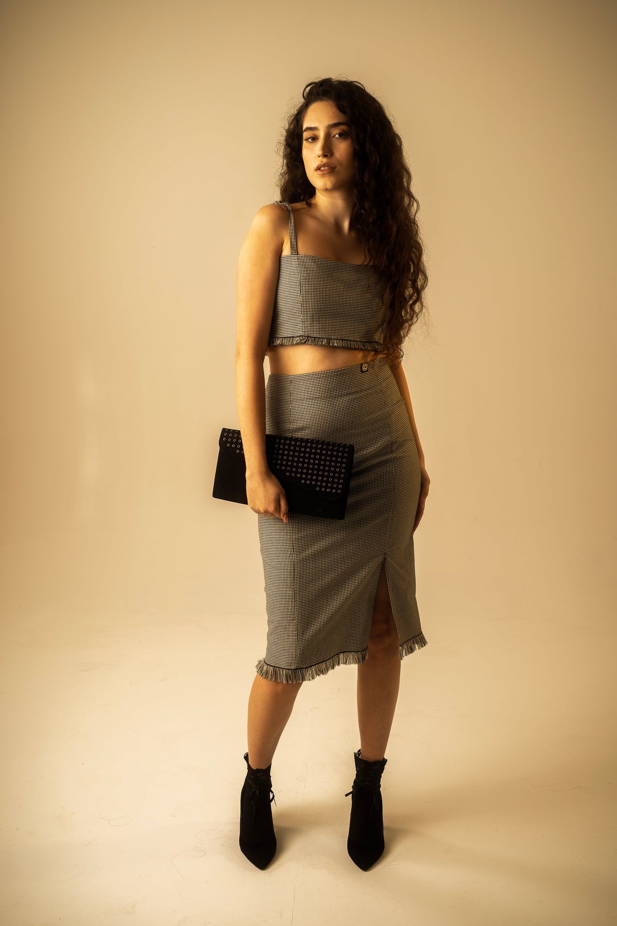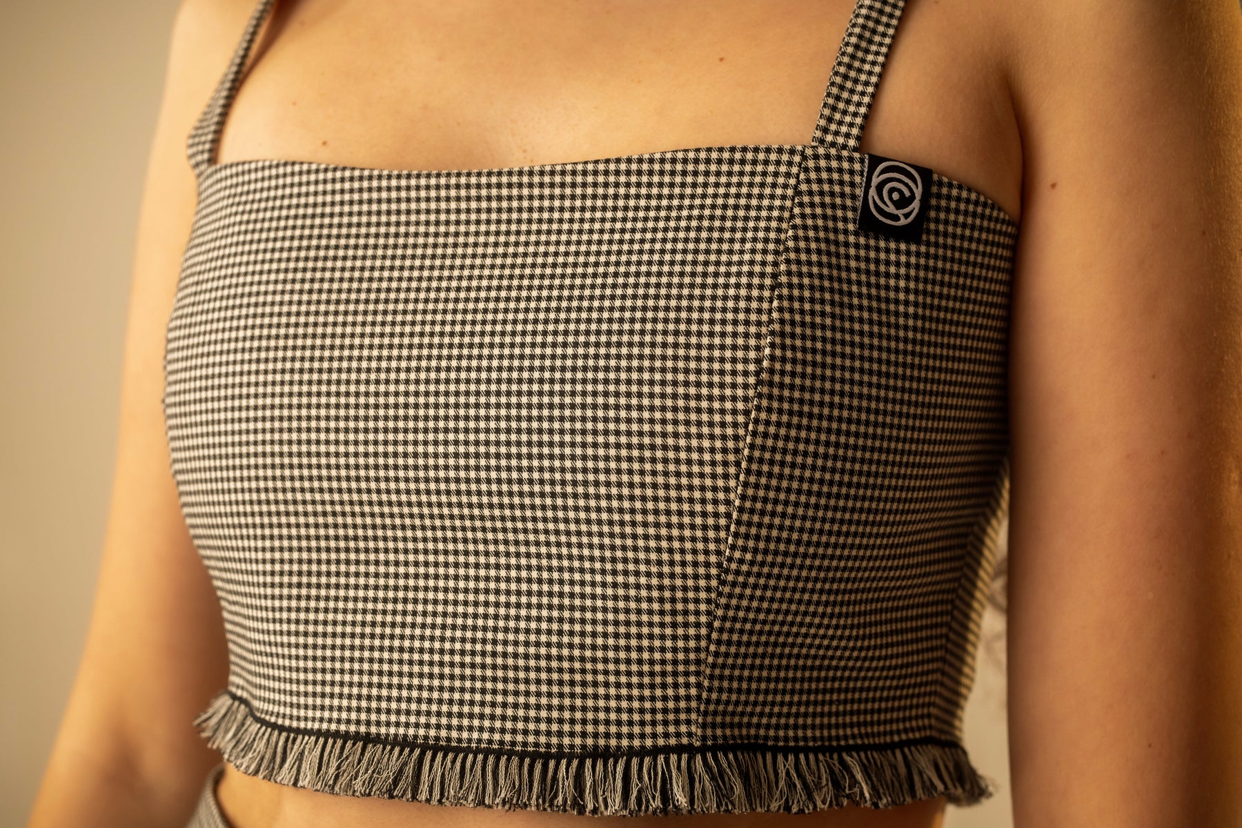 Add a touch of texture and edge to your wardrobe with our Check Bralette—a cropped, fitted piece crafted in our signature monochrome check. The standout fringe hem and contrast pattern give it a bold, tactile finish, while the elasticated straps and metal popper back ensure all-day comfort.