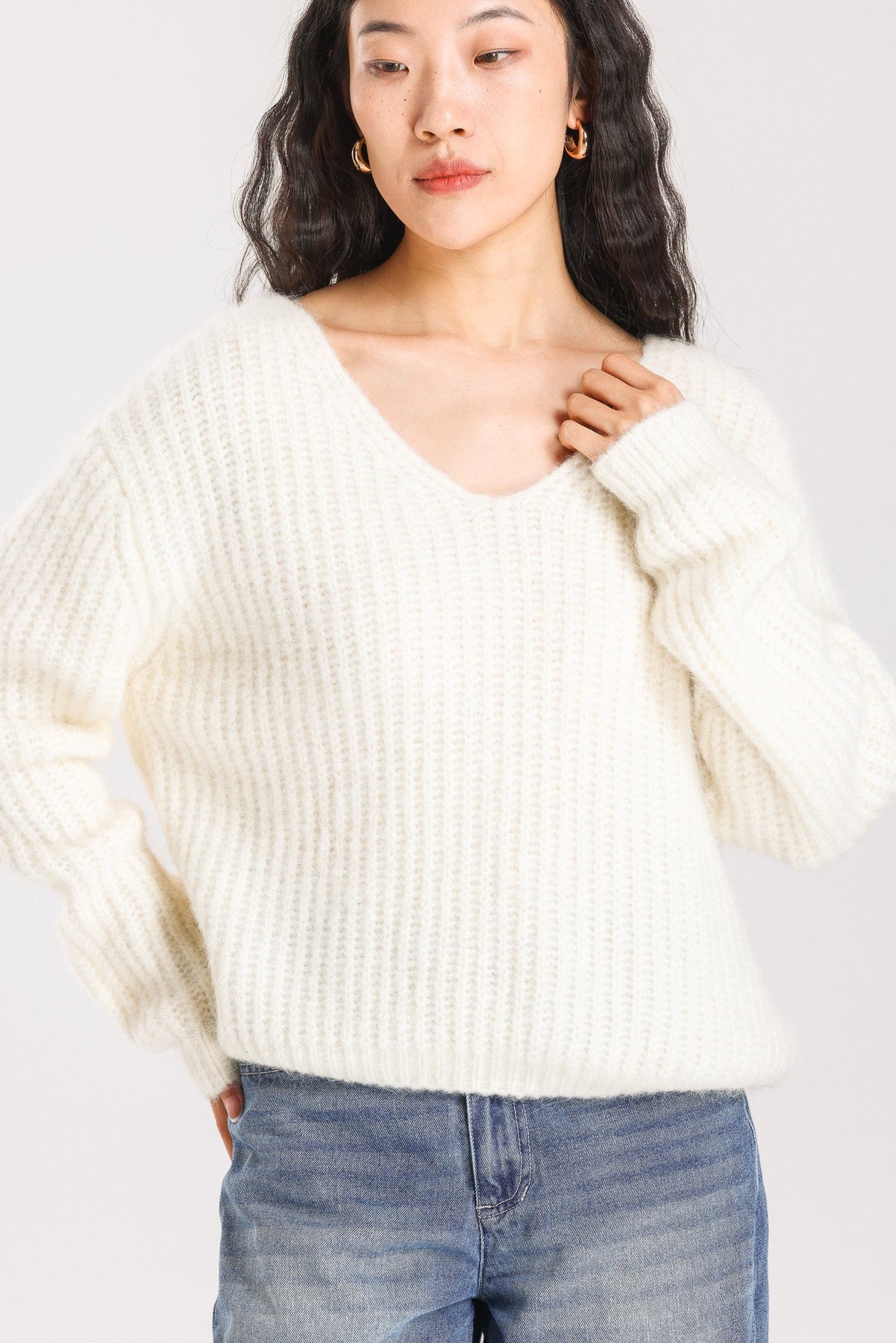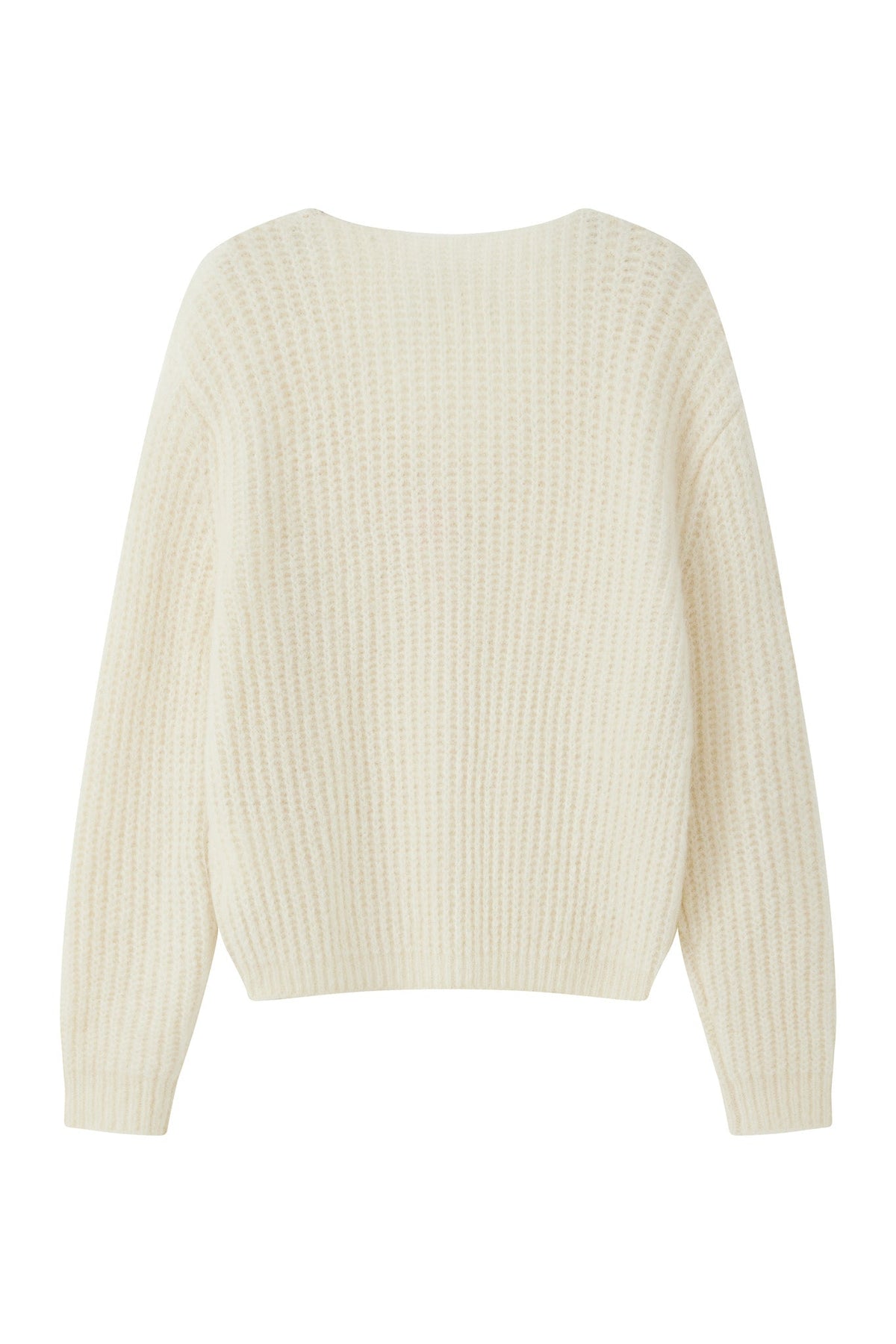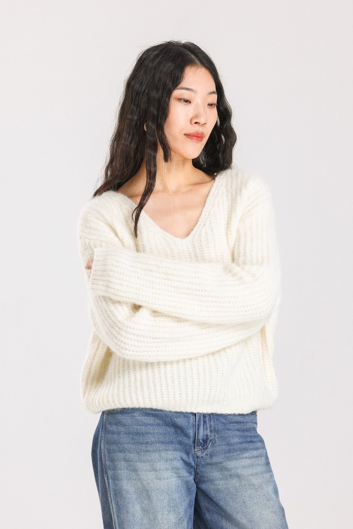 This cream jumper features a relaxed fit with a V-neckline, bringing a timeless elegance to your wardrobe.