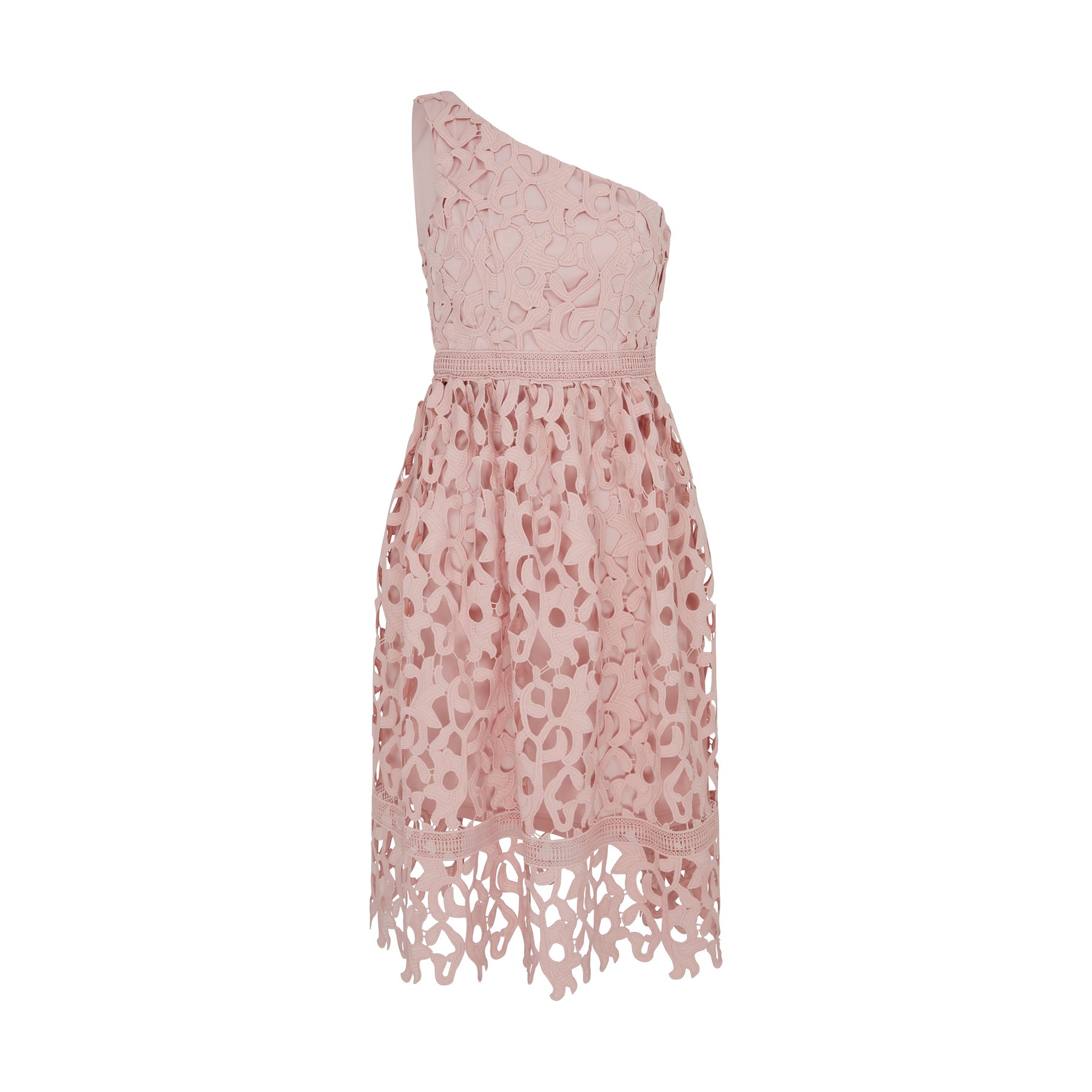 Highlights of One Shoulder Lace Dress in Misty Rose Pink
