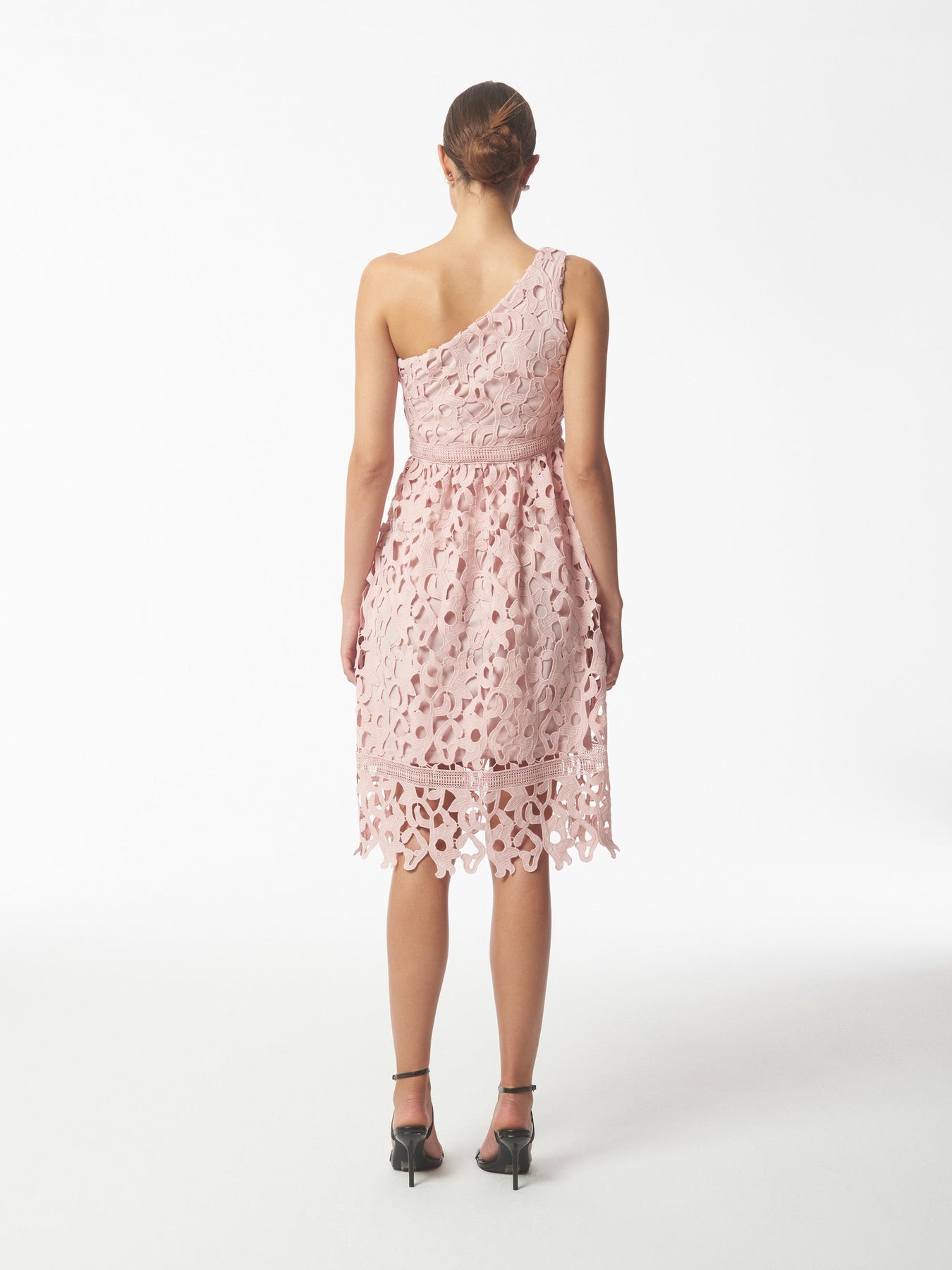 Created in misty rose pink and adorned with guipure lace, this asymmetric dress is as timeless as they come. It features a sleek silhouette, while the fitted waist and the midi skirt add a touch of sophistication. Complete the look with stilettos for a long-awaited event. Also available in white.