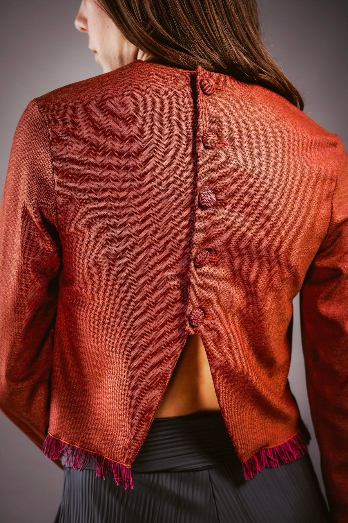 Our distinctive Orange Fringe Top has a relaxed silhouette and front wrap detail. Visually inspiring details like the fringed edges and distinctive back button detail complete this unique piece.