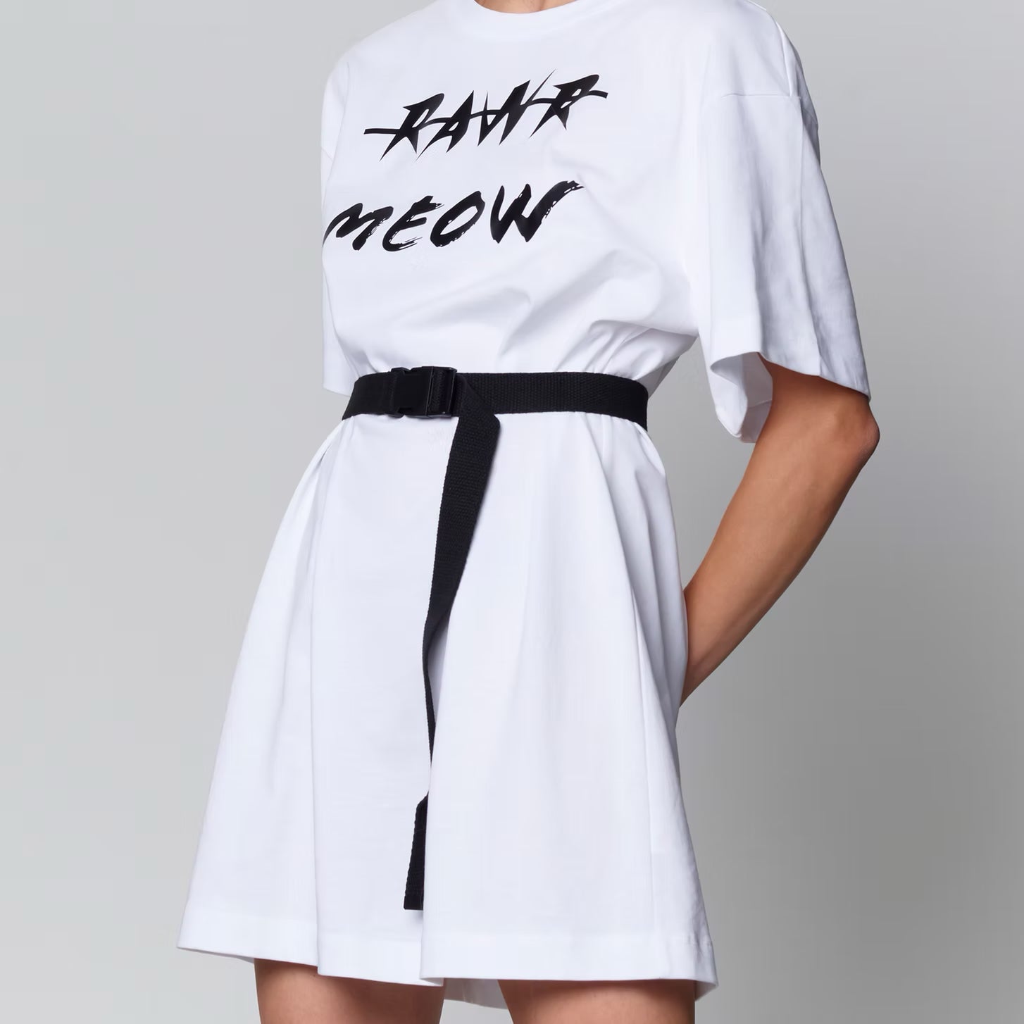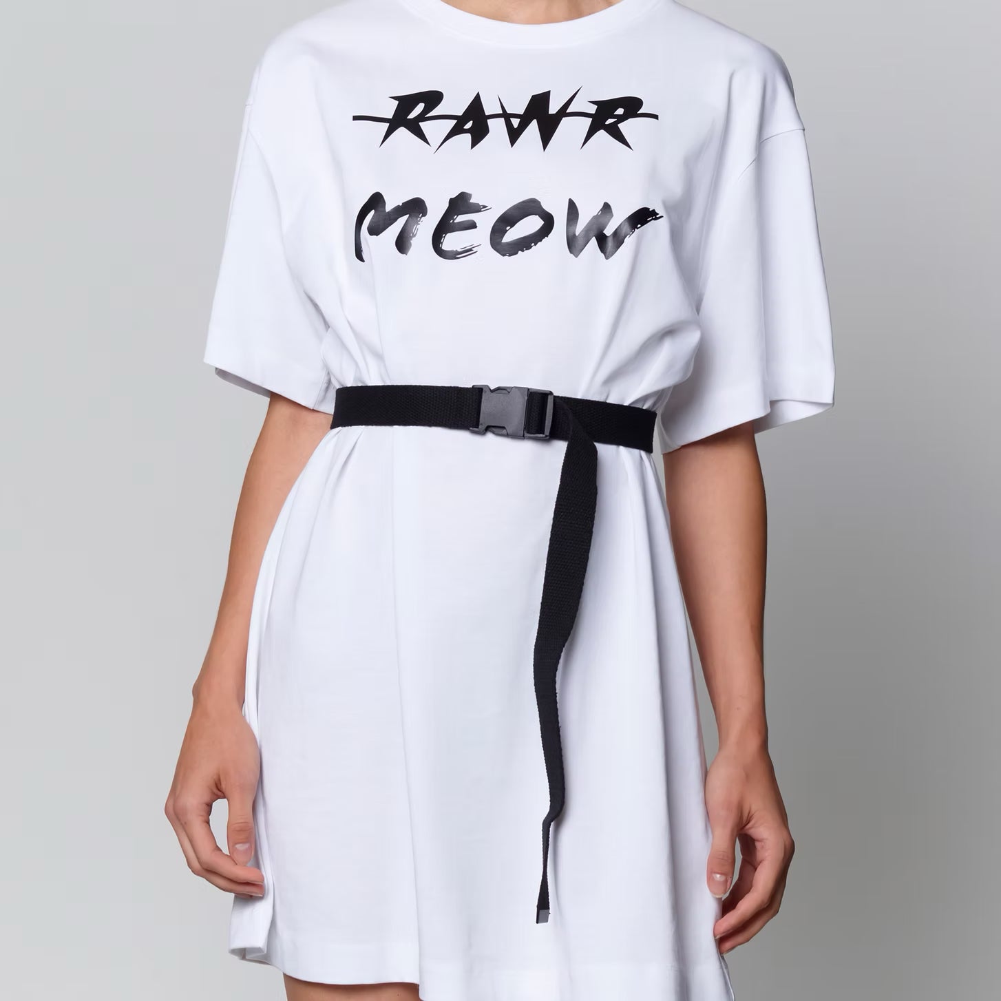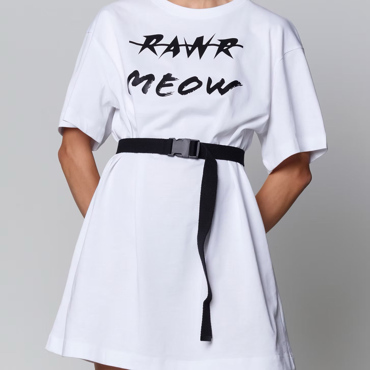 An artistic expression of duality, softness and strength, play and defiance. The Meow / Rawr oversized T-shirt Dress transforms a simple silhouette into a statement. (belt not included)