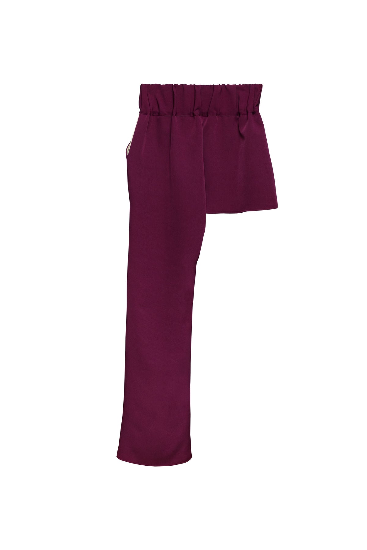 Asymmetric long straight trousers-shorts made of maroon knit featuring a nude color pocket. Crafted in upcycled polyester and organic cotton, it has an elastic gathering at the waistband, and tailored pleat on the front for a better comfort. Perfect to combine with our Half-Skirt Cape.