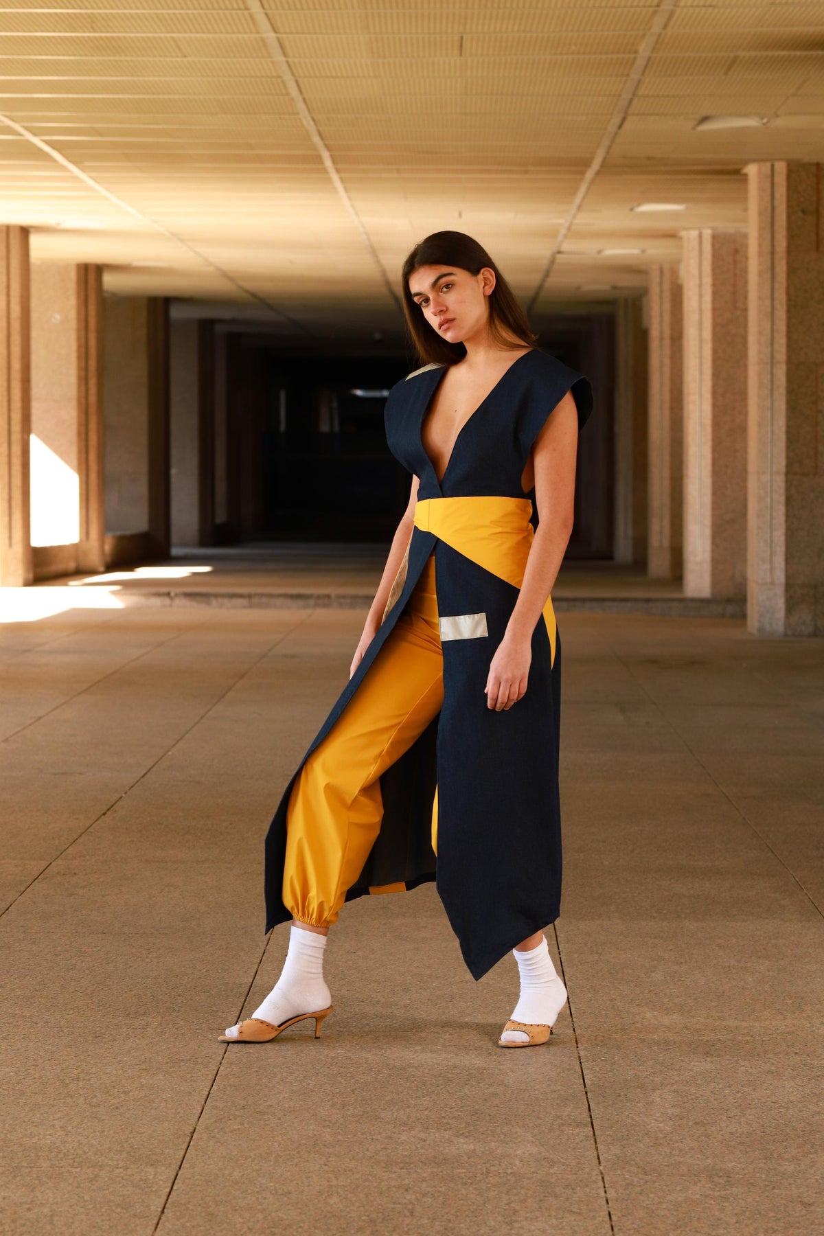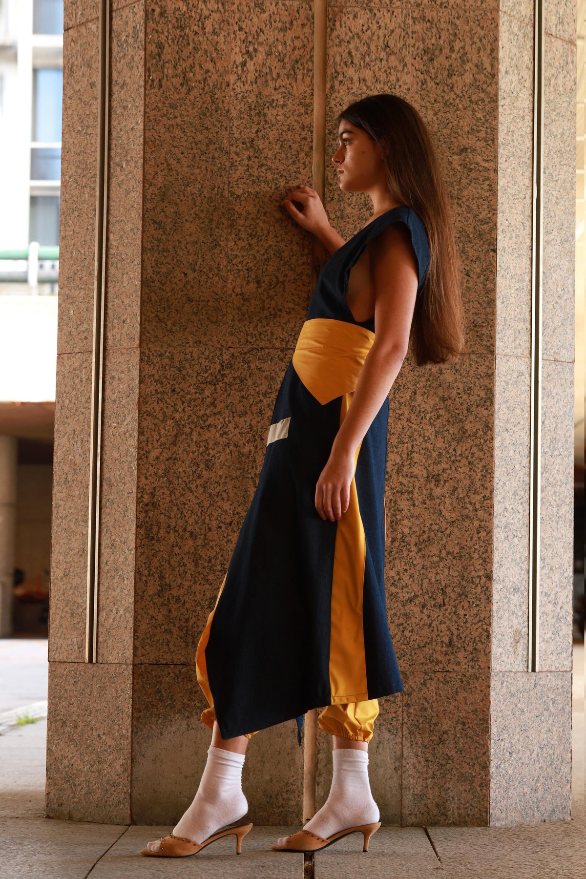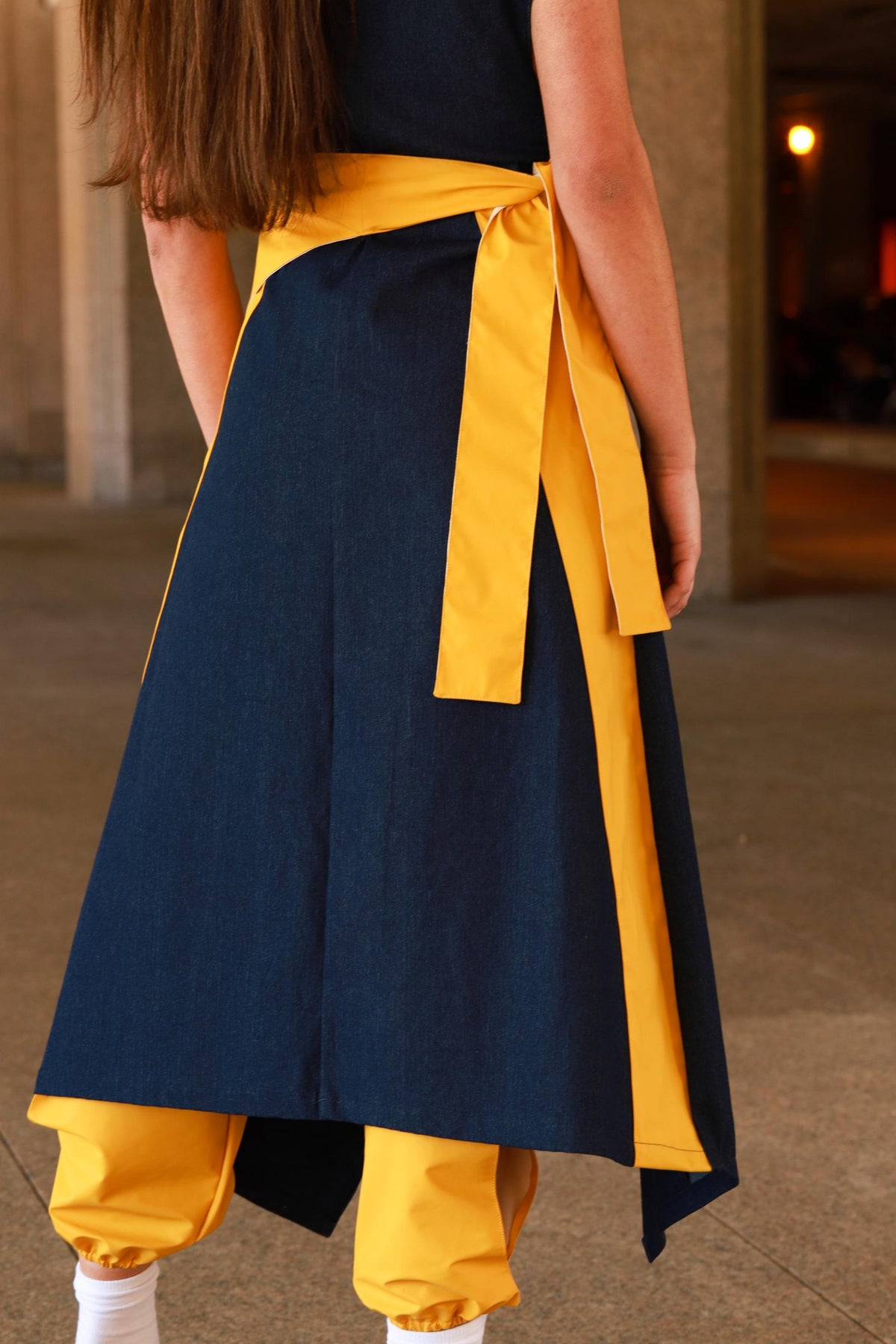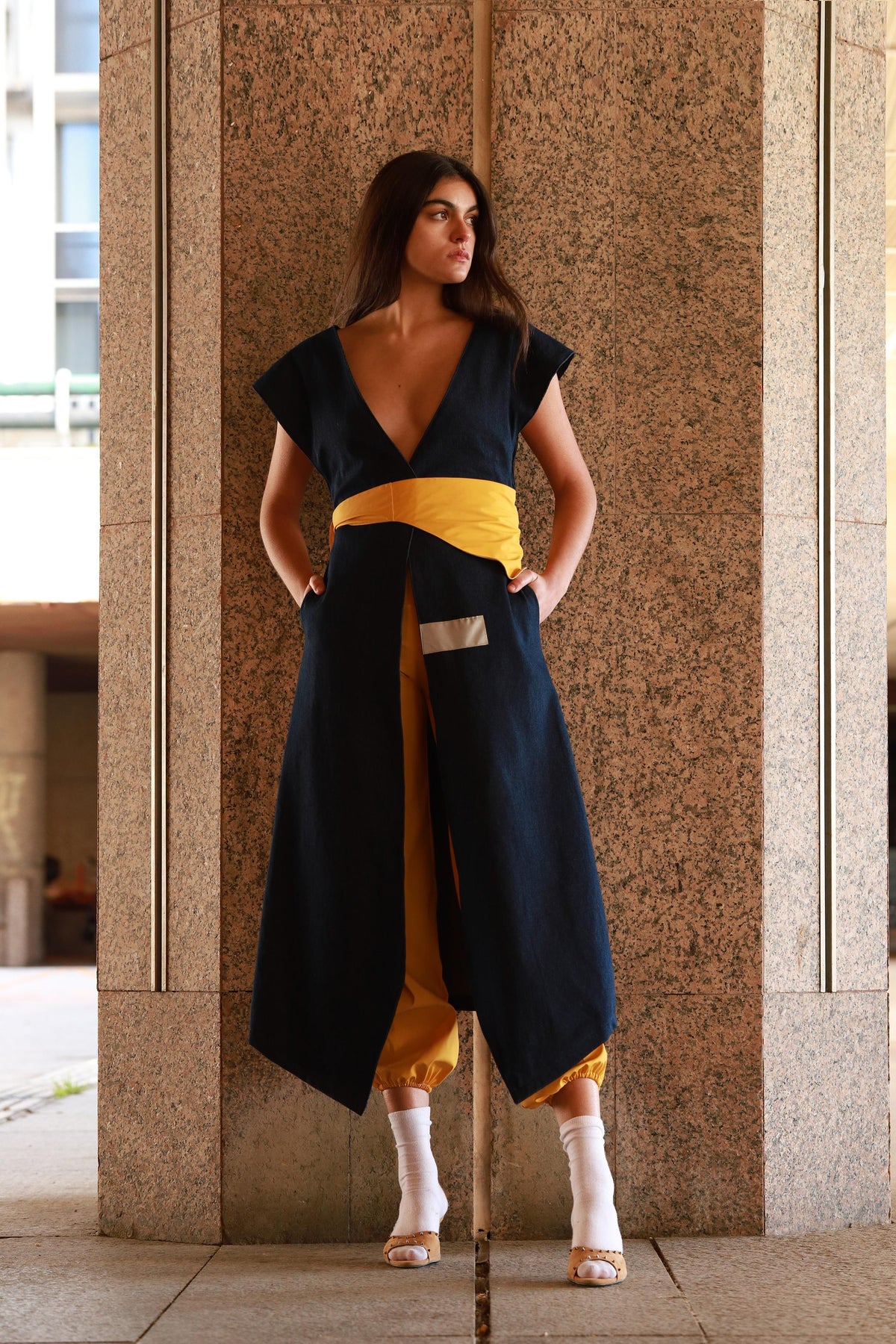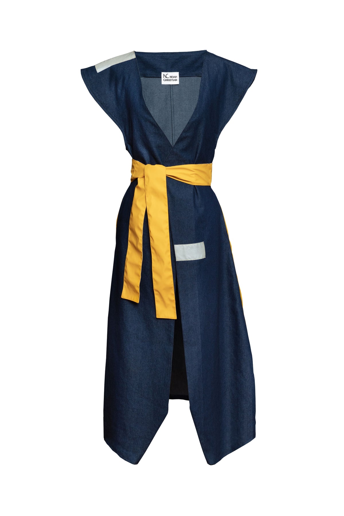 This long coat dress is an elegant wrapped piece. Crafted in navy blue lightweight denim and yellow recycled polyester, it has one pocket at each side that makes it more comfortable. Featured with yellow waterproof side stripes at the back and two gray reflective details at the front, it matches perfectly with the yellow belt creating a Japanese kimono effect. This sleeveless dress-coat will elevate any look with a refined touch.