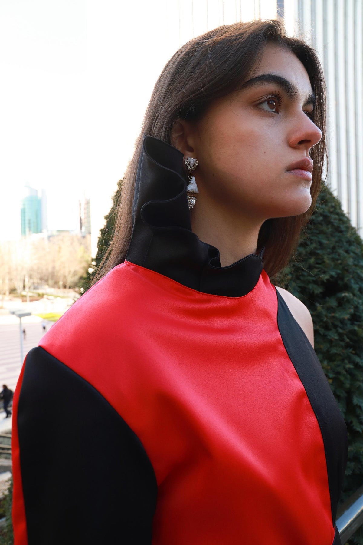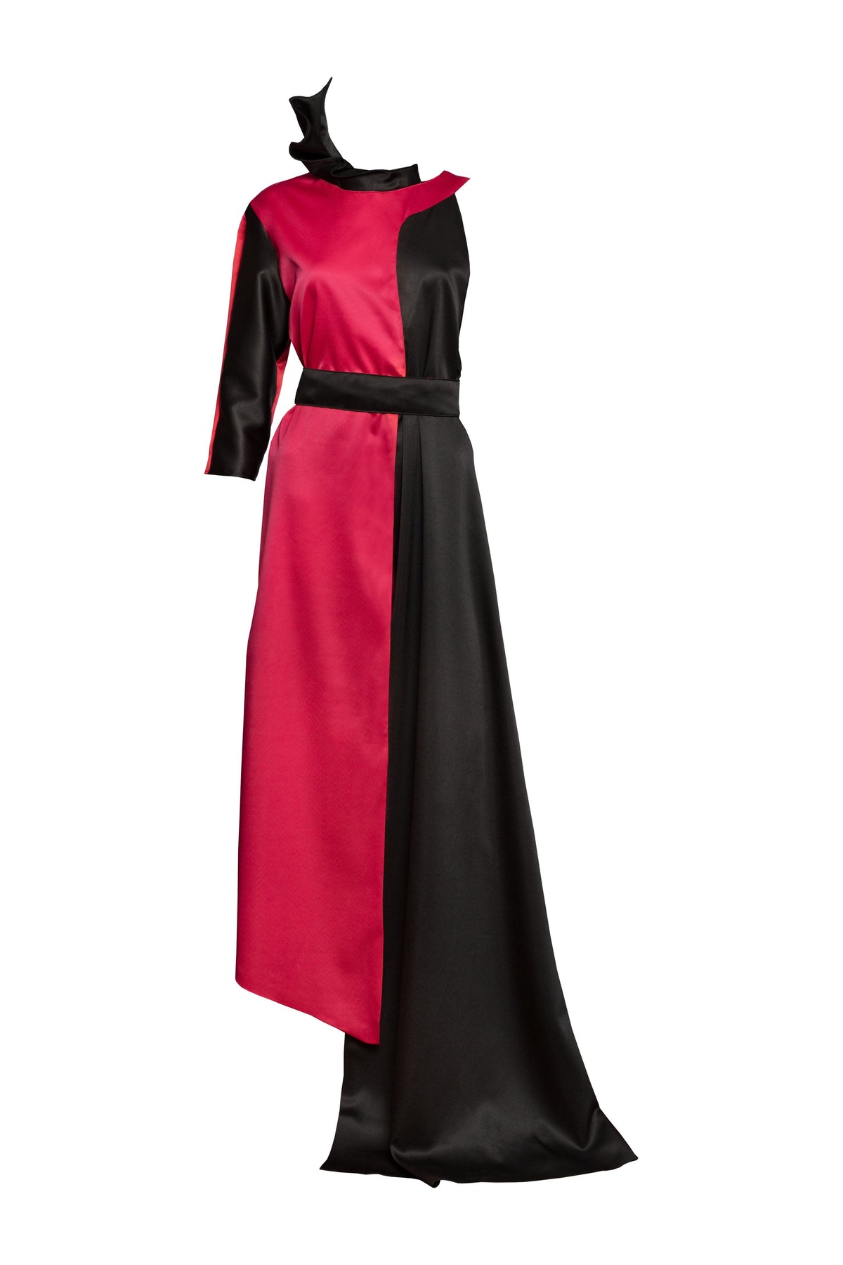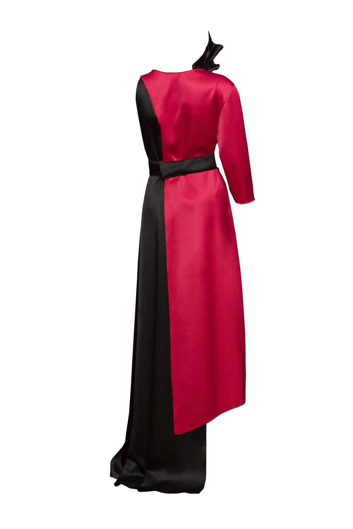 This long asymmetric dress made of red and black satin has a contrasted structure and a Noah Christian pleated fantasy collar. Button closure on the shoulder. Featuring one short sleeve and a comfortable fit, it has an asymmetric cut that makes it a collectible, exclusive and recognizable piece.