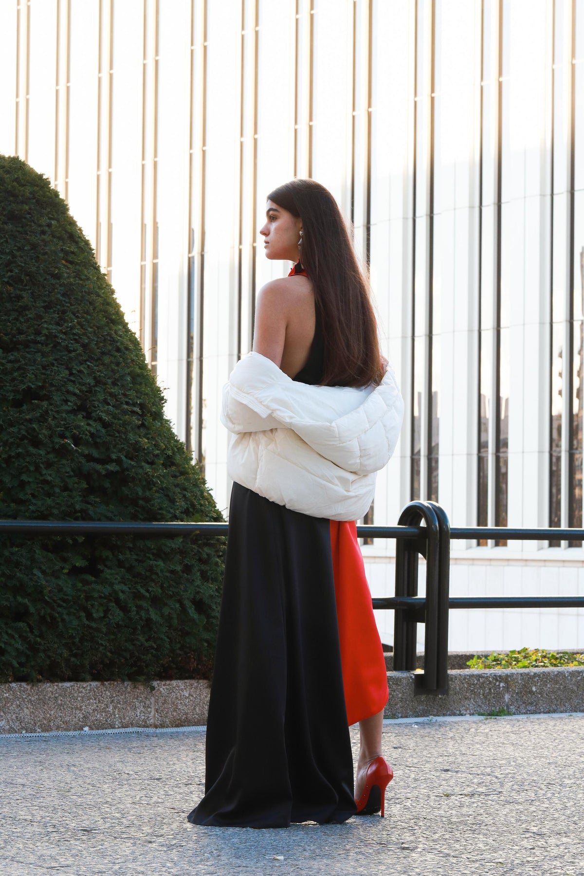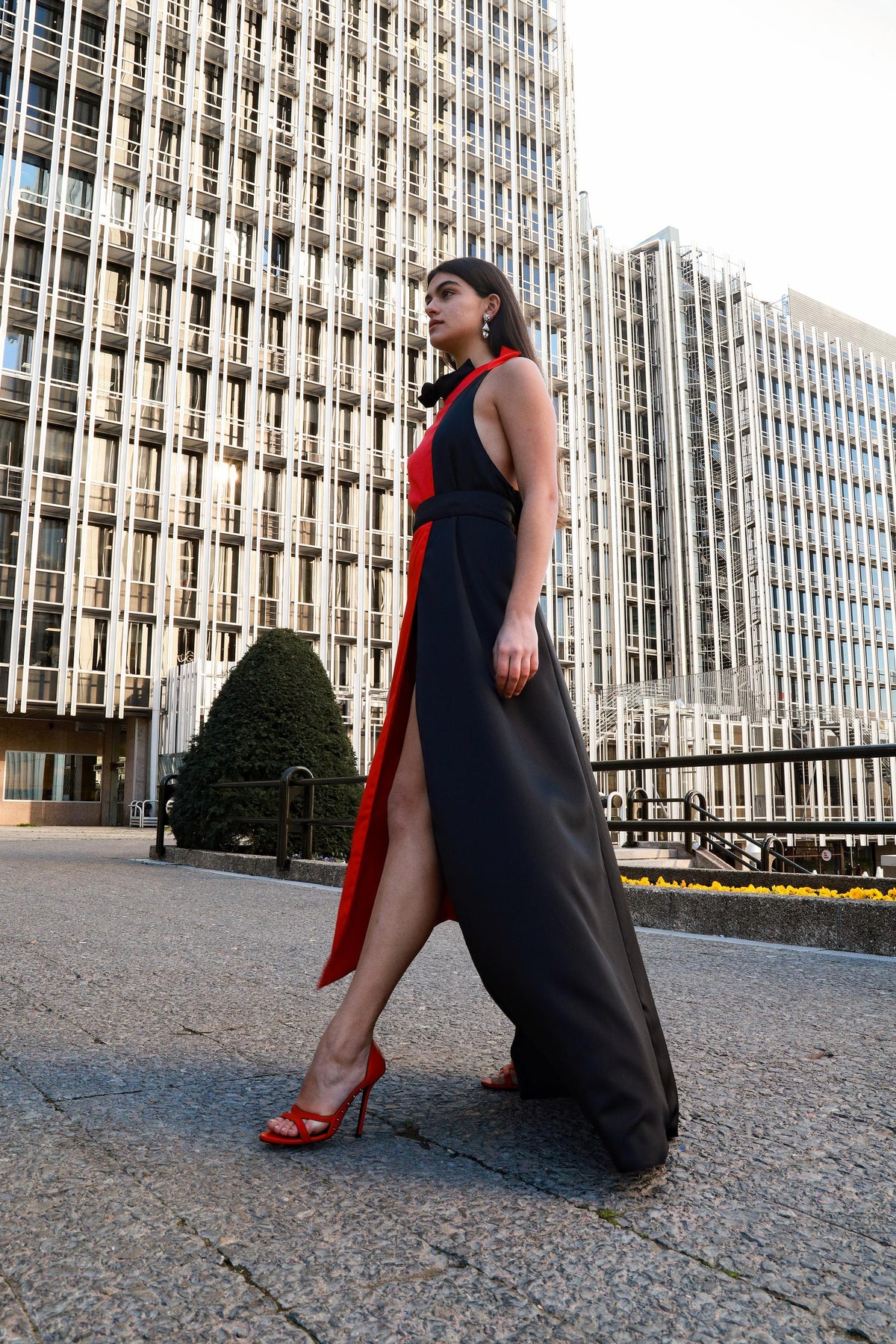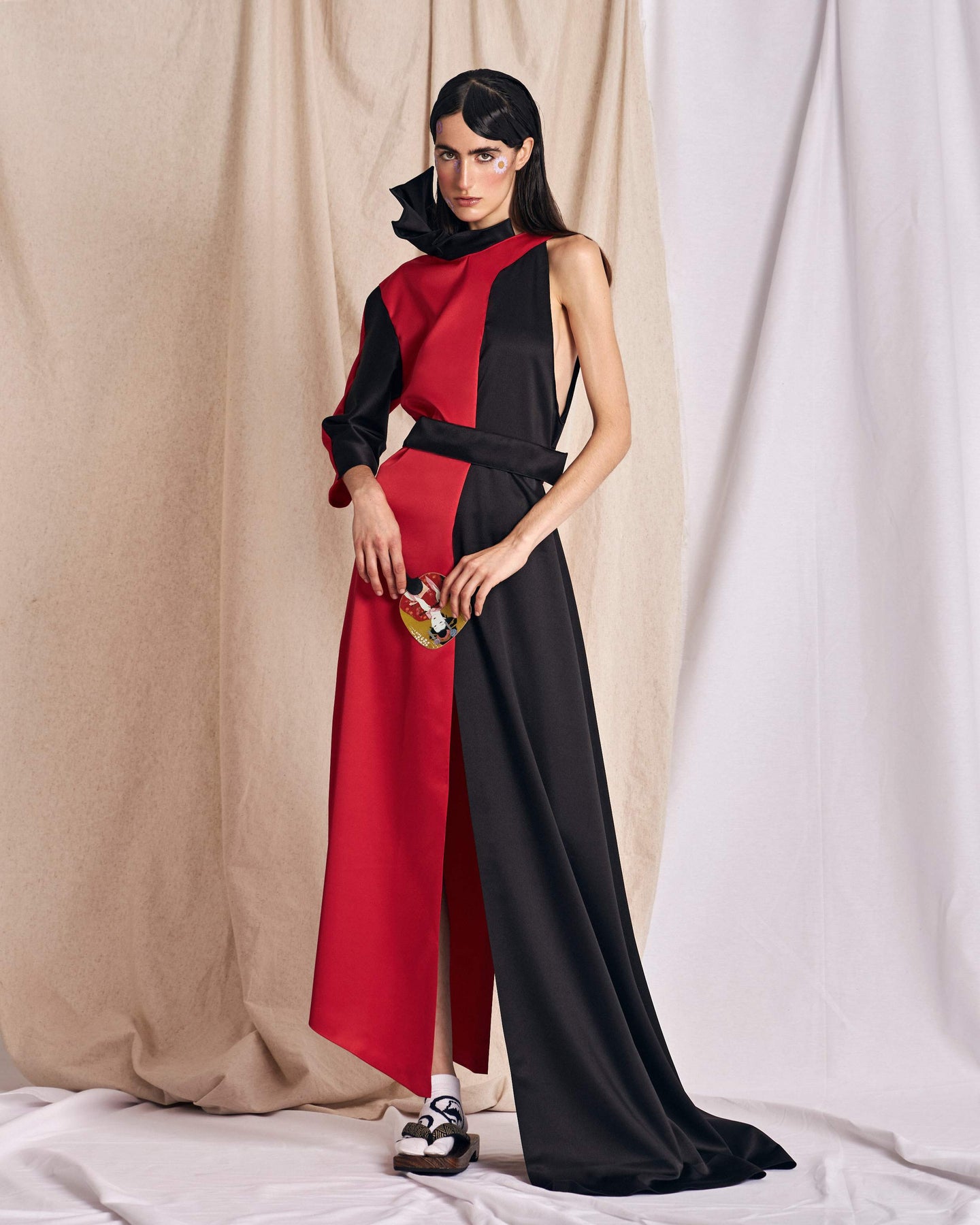 This long asymmetric dress made of red and black satin has a contrasted structure and a Noah Christian pleated fantasy collar. Button closure on the shoulder. Featuring one short sleeve and a comfortable fit, it has an asymmetric cut that makes it a collectible, exclusive and recognizable piece.