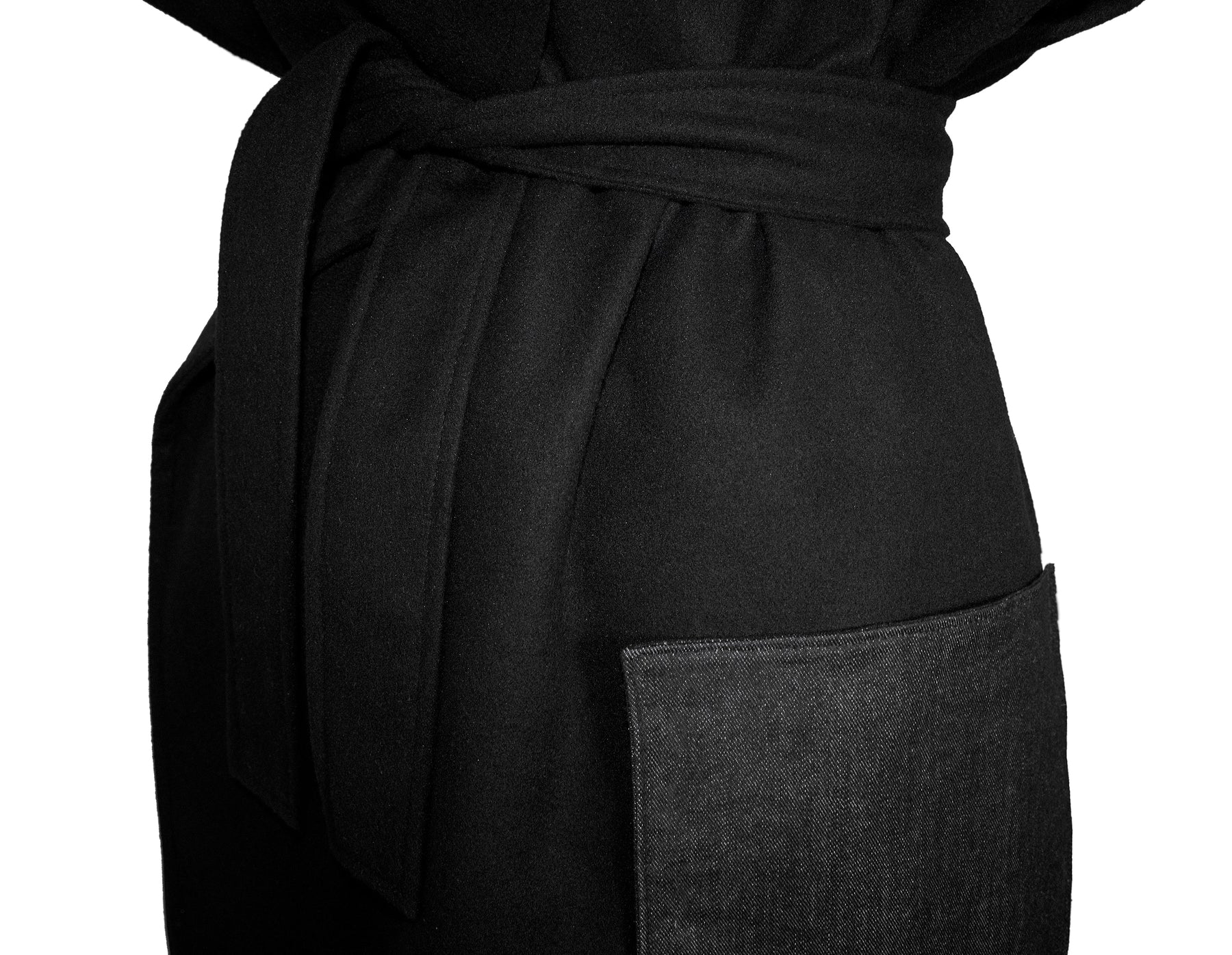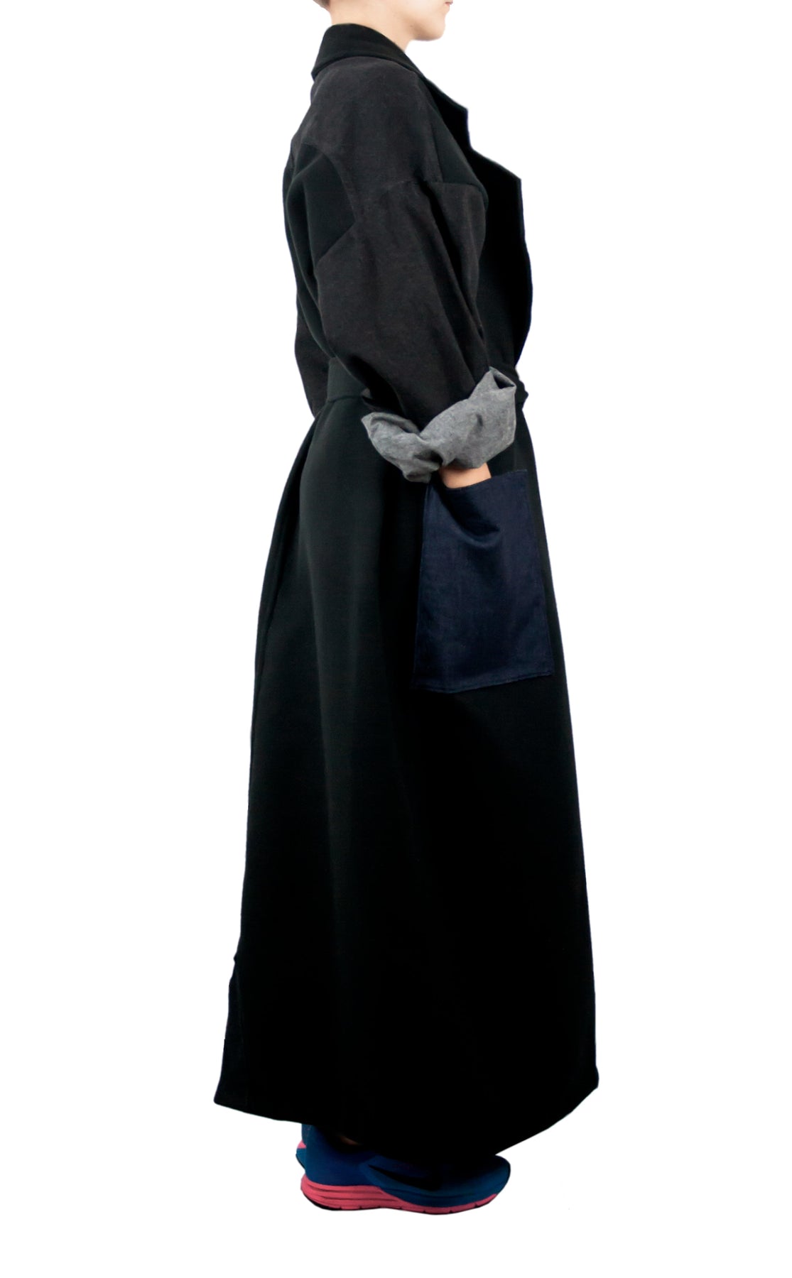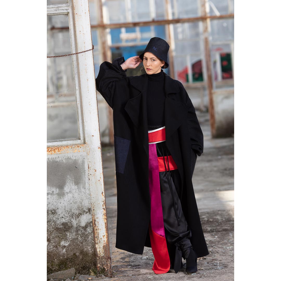 This oversized coat pairs a modern and yet classic silhouette with denim details featuring a double-breasted closure and a back yoke in black denim. Cut in double sided felt-cloth, it is embellished with one large navy blue and one large black patch pocket. Featuring wide notched lapels and accompanied with a black belt at the waist, it also has different pocket colors that makes this oversized coat a special and differential designer piece.