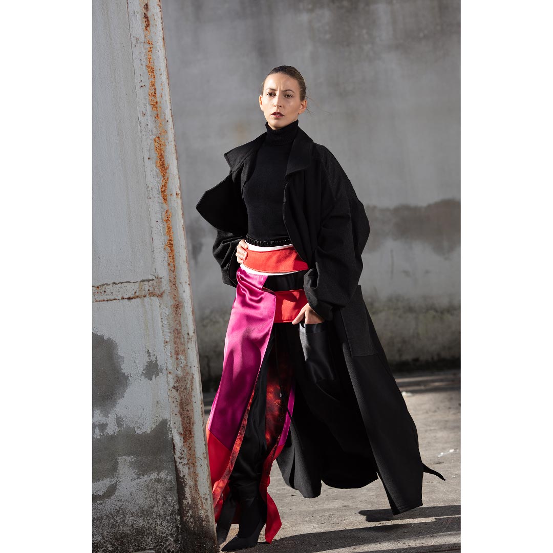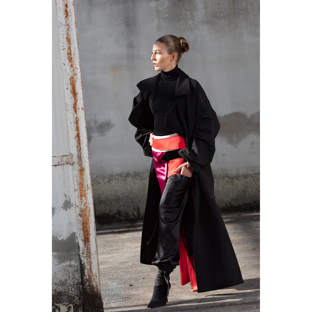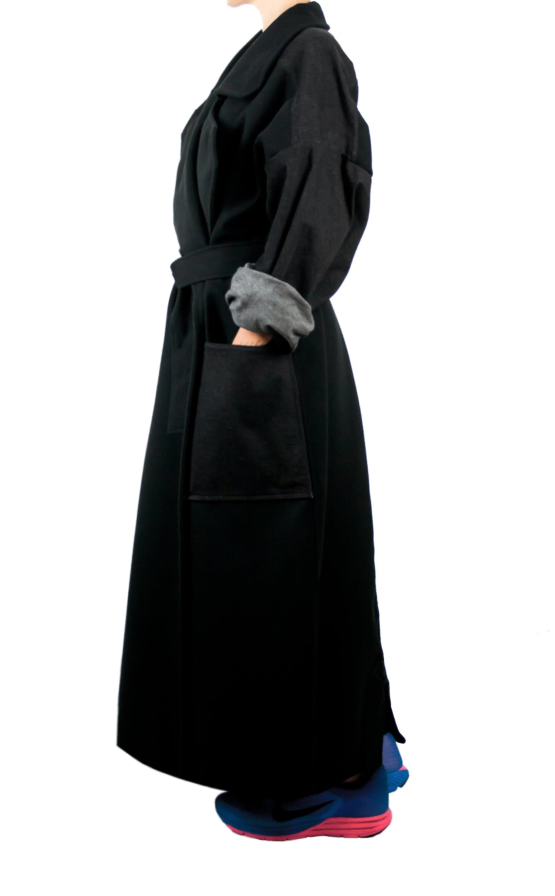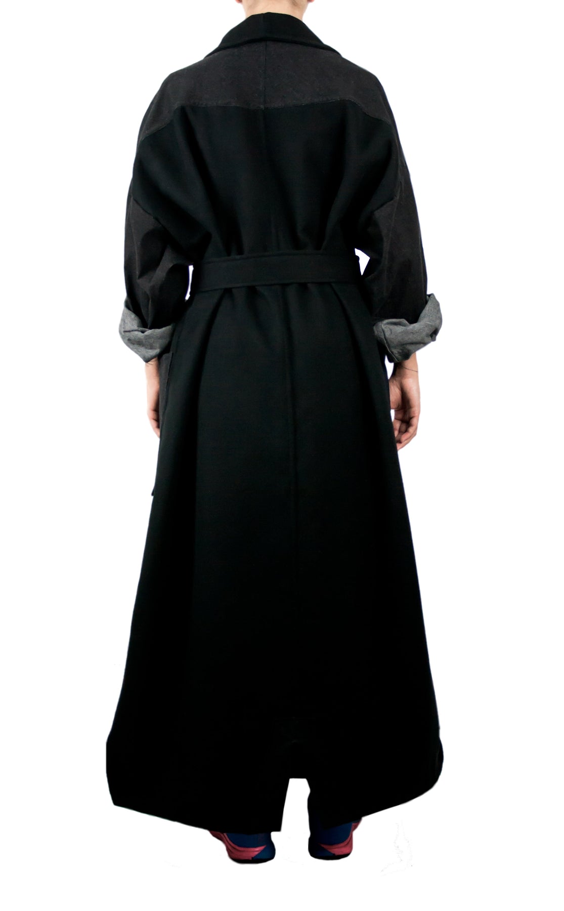 This oversized coat pairs a modern and yet classic silhouette with denim details featuring a double-breasted closure and a back yoke in black denim. Cut in double sided felt-cloth, it is embellished with one large navy blue and one large black patch pocket. Featuring wide notched lapels and accompanied with a black belt at the waist, it also has different pocket colors that makes this oversized coat a special and differential designer piece.