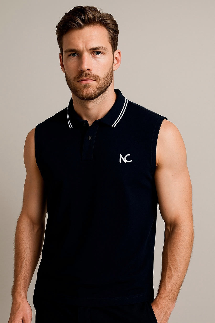 Refined simplicity meets modern edge. Our sleeveless NC polo-vest shirt is crafted from high-quality, impurity-free piqué cotton for a clean, breathable feel. Designed in a classic fit, it features a ribbed polo collar, a clean two-button placket, and our signature NC logo delicately embroidered in white.