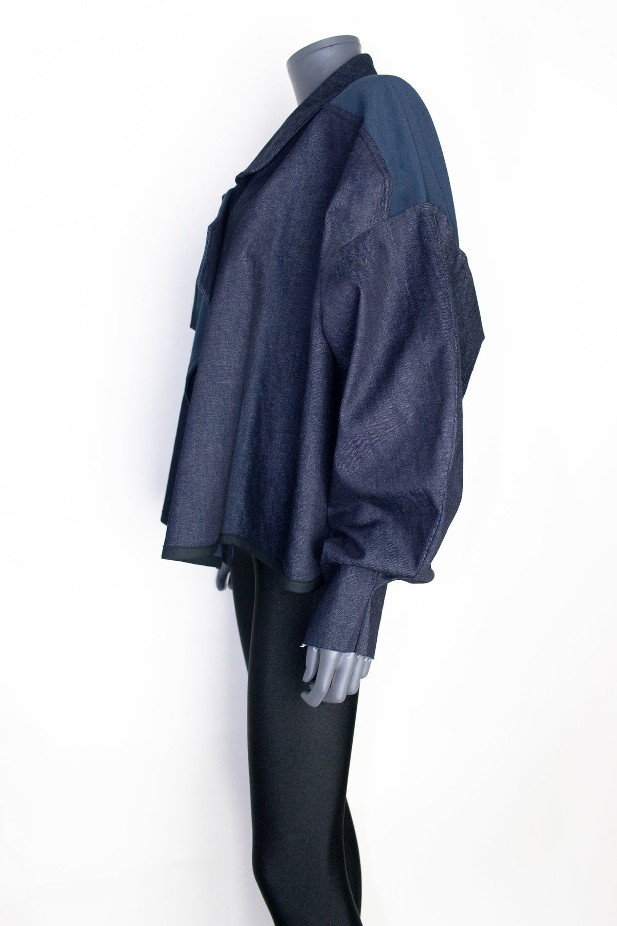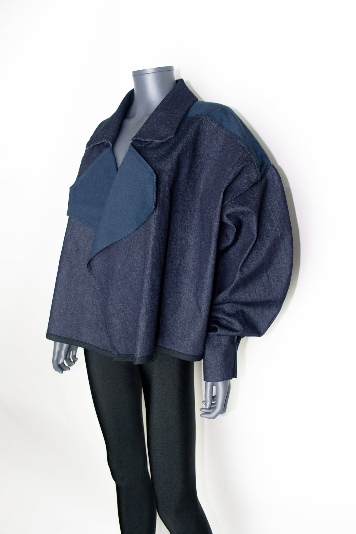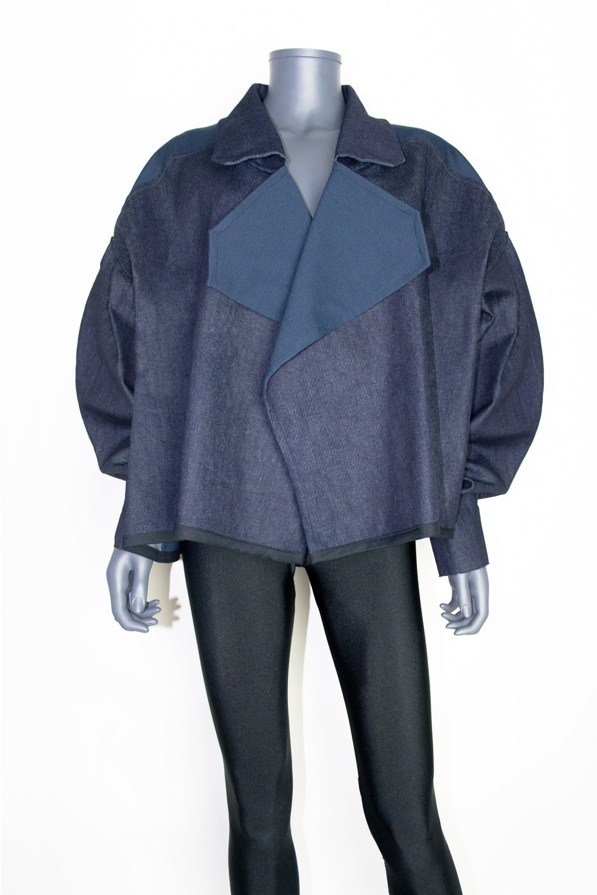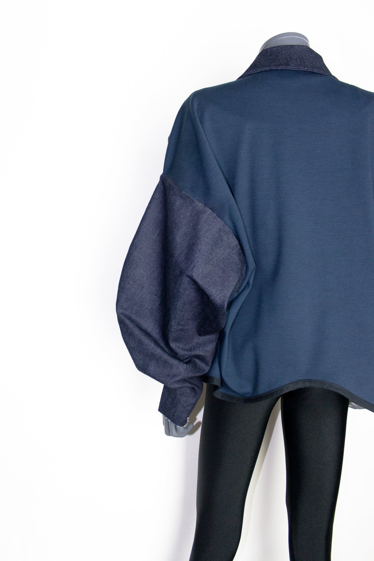 Sensu "扇子" means "hand fan" in Japanese, it is an original oversized blazer from NC's Dark-Line collection. Designed with hand fan-like Sensu sleeves finished with a raw cut, it is crafted in denim and knit featuring a tailored denim collar and a single-breasted press-stud closure. The navy blue Ponte di Roma knit delicately highlights the back and further defines the style combining it with a night blue denim front. This blazer is a distinctive designer piece inspired by Japanese culture.