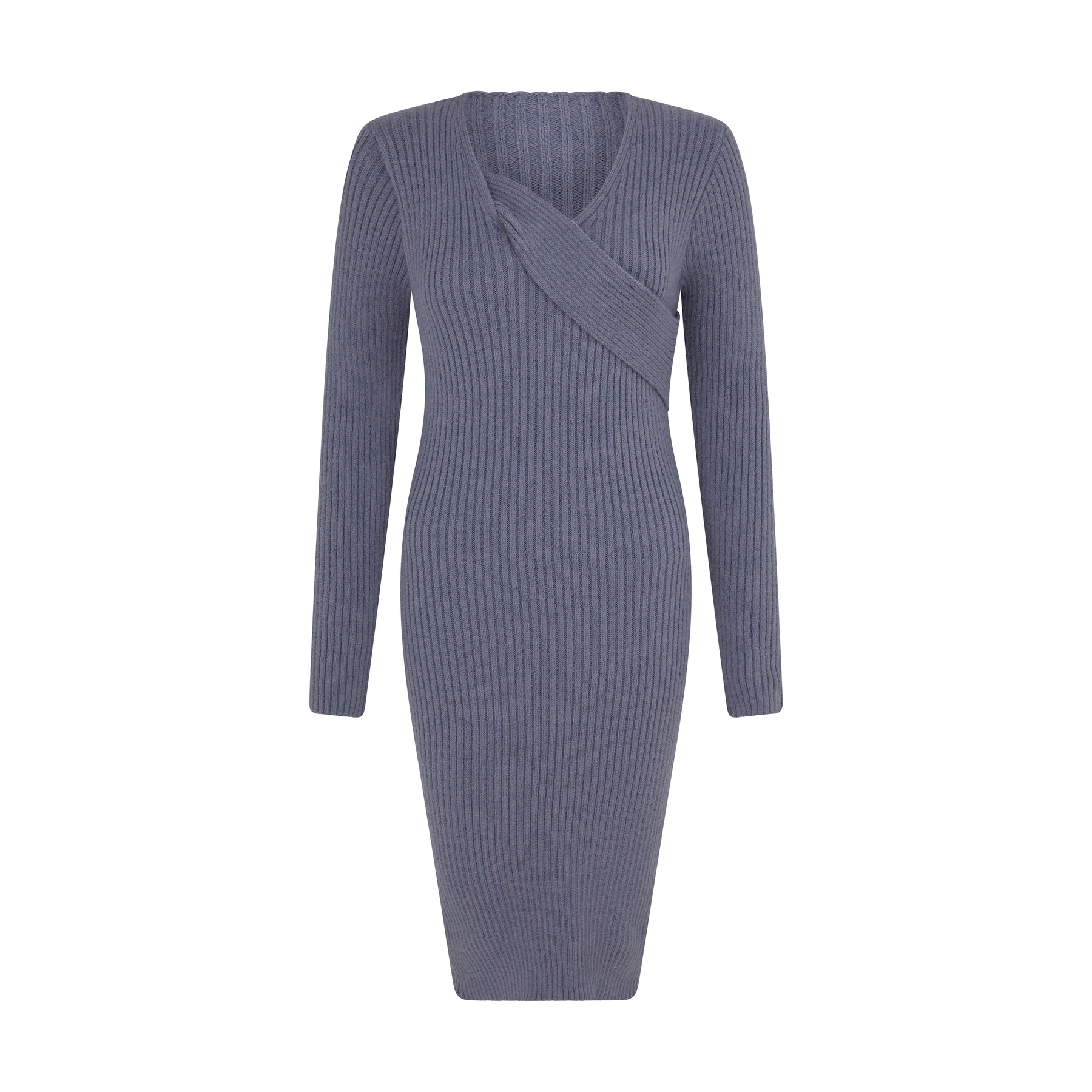This knit midi dress from SOUR FIGS features a cadet grey color palette and a unique slant band at front. Created from a super soft knit, with an asymmetric design and v-neck silhouette, this beautiful sweater dress provides both style and comfort. This wardrobe essential knitwear piece could make a perfect look for any occasion.