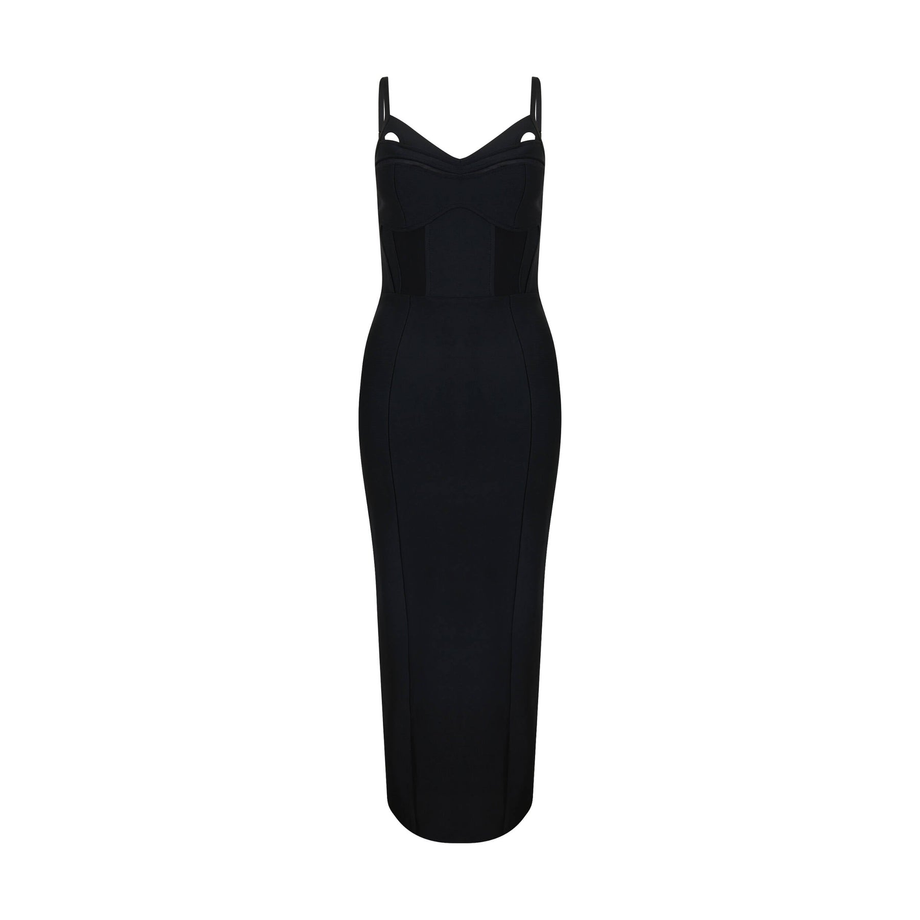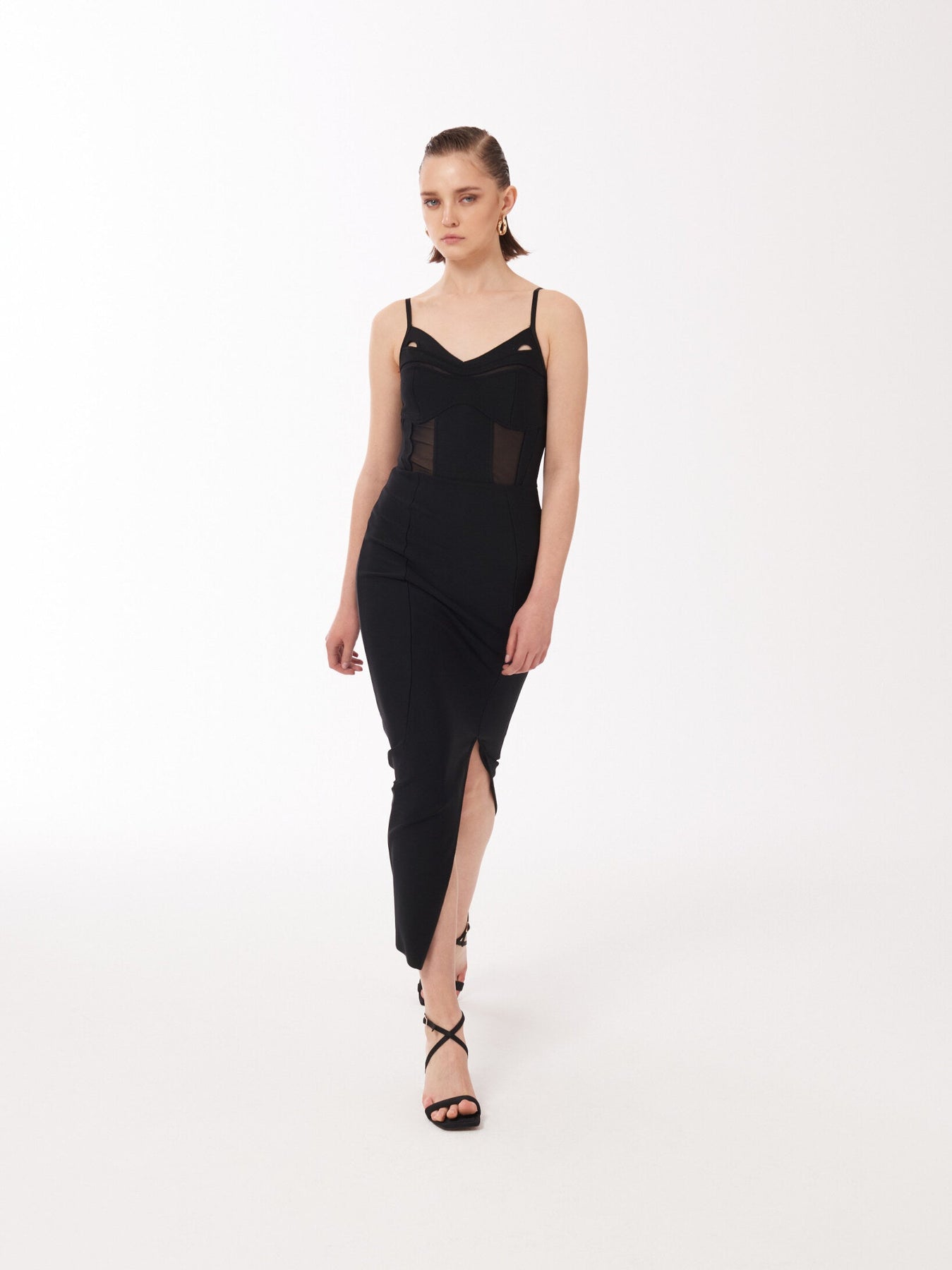This slinky black dress speaks to the season's reveal-and-conceal trend with its corseted tulle bodice and side slit. It's a dress that sculpts your figure in sinuous lines with corseted boning, veiled in mesh panels. It comes with adjustable shoulder straps and hidden zip at back. Style yours with high heels or zip front heeled boots.