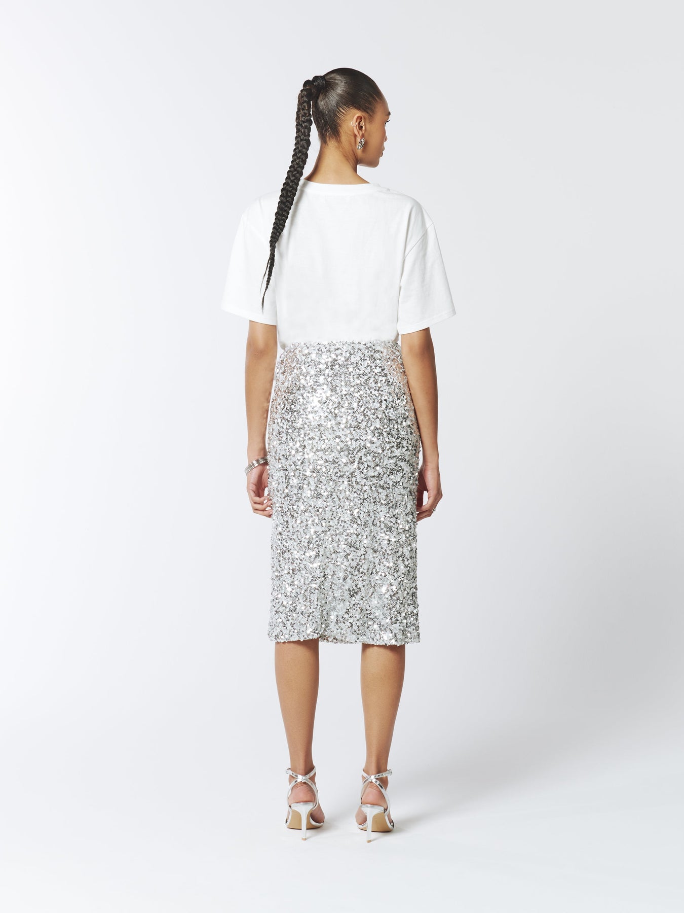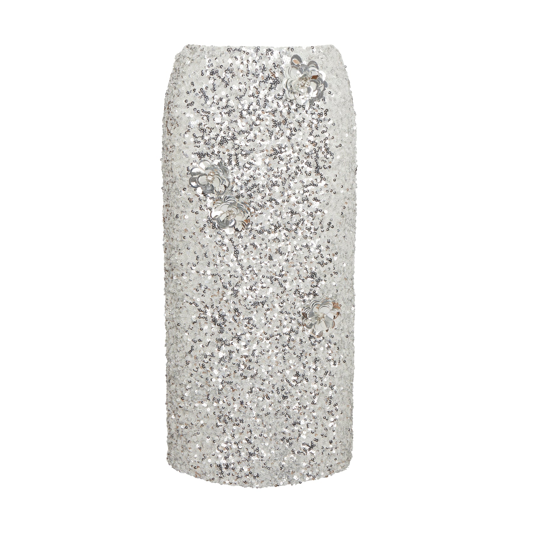 Turn up the sparkle with this stunning midi skirt. Adorned with shimmering silver sequins and embellished further with clusters of 3D paillette flowers, this skirt adds beautiful dimension and captivating elegance.