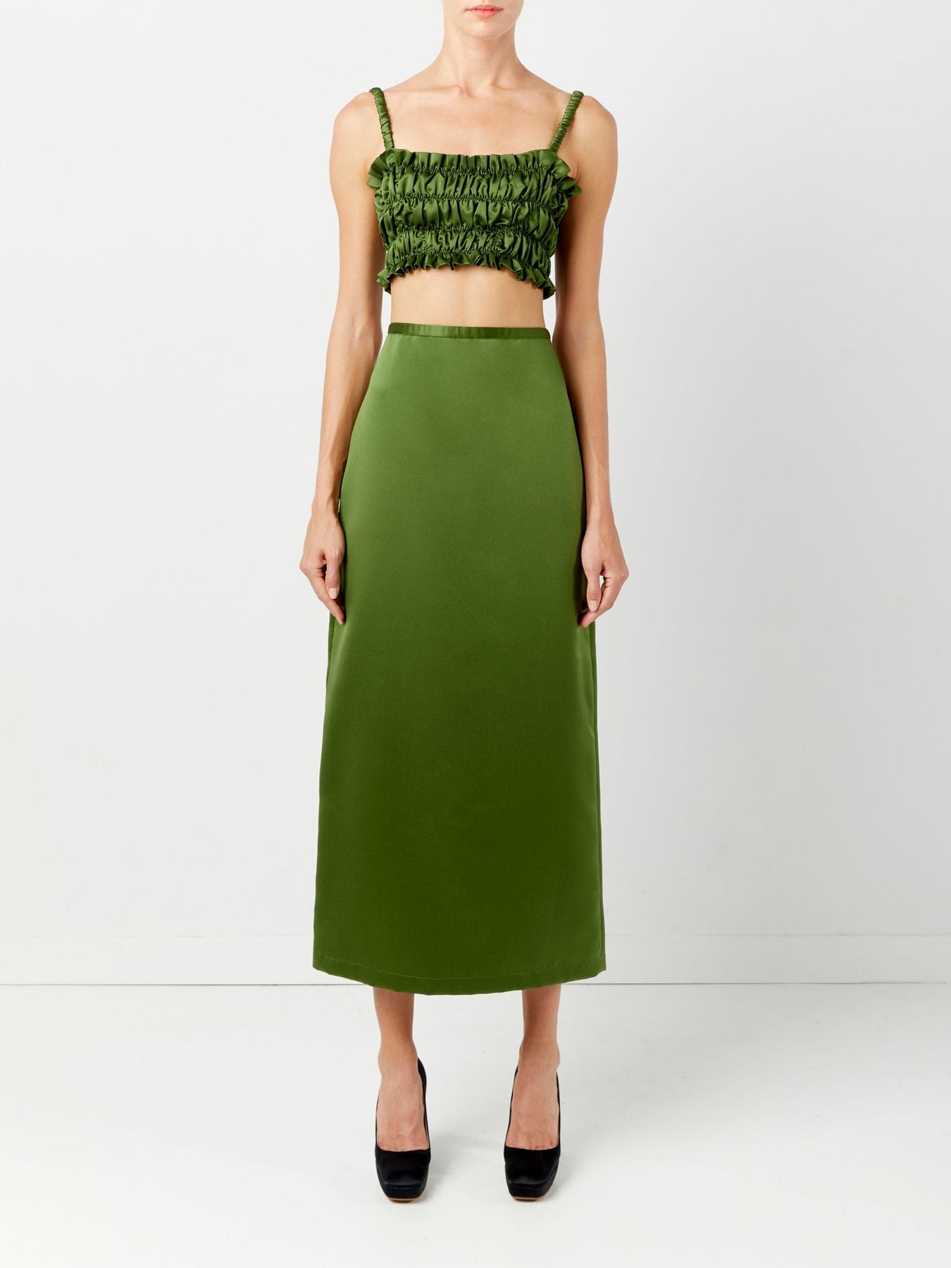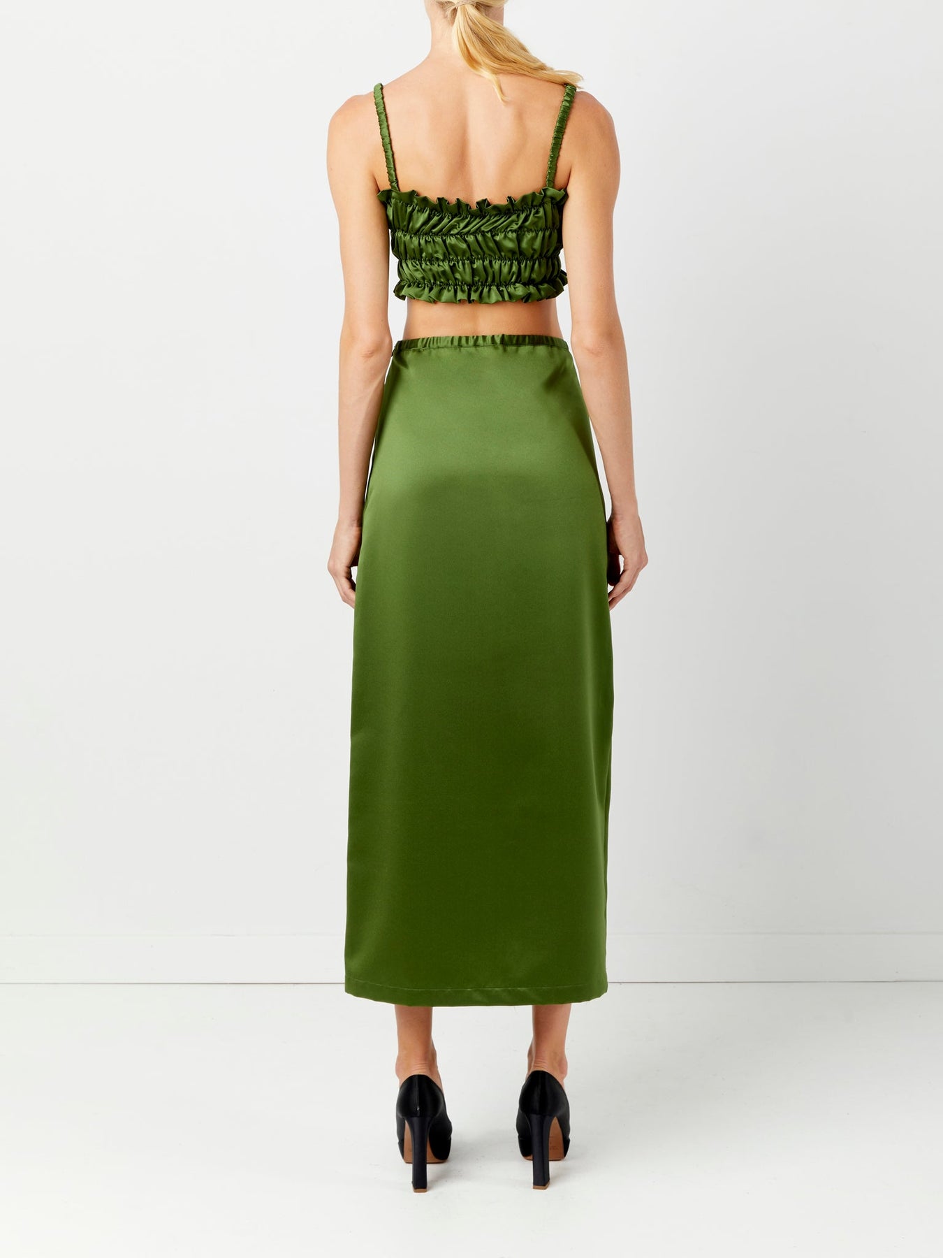 Great for day or night, this skirt looks best with our coordinating smocked top, but also pairs beautifully with one of our ribbed tops or bodysuit. Made from 100% silk.