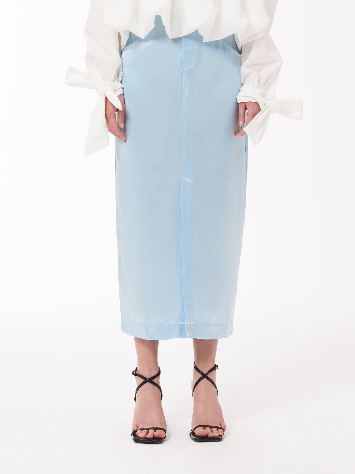 Be effortlessly stylish with this baby blue skirt. It features a midi fit, baby blue satin finish and tie waist detail. Style with our Volume-pleated Tie Cuff Shirt or just a white top to simply dress up or down.