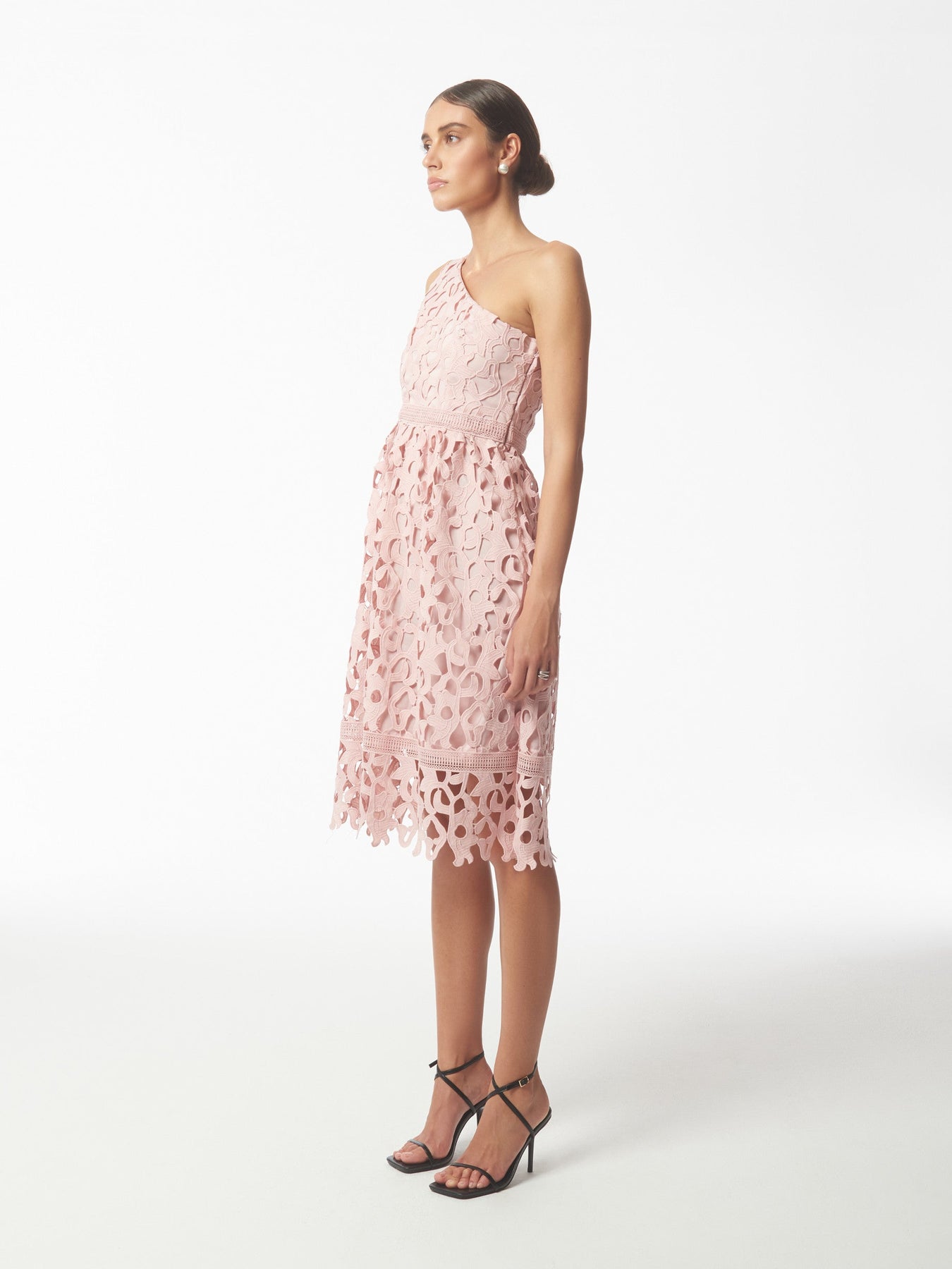 Highlights of One Shoulder Lace Dress in Misty Rose Pink