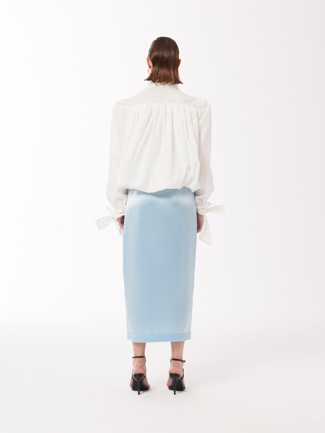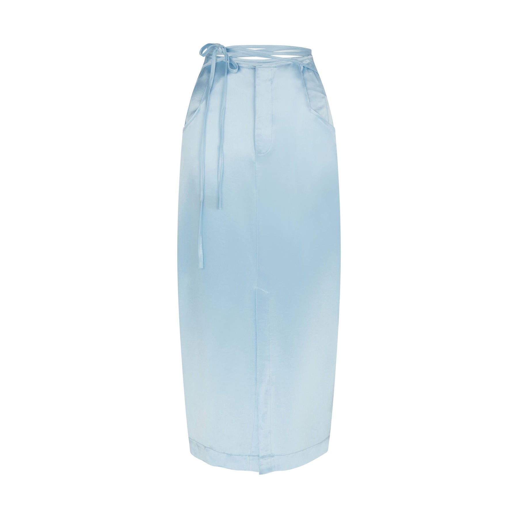 Be effortlessly stylish with this baby blue skirt. It features a midi fit, baby blue satin finish and tie waist detail. Style with our Volume-pleated Tie Cuff Shirt or just a white top to simply dress up or down.