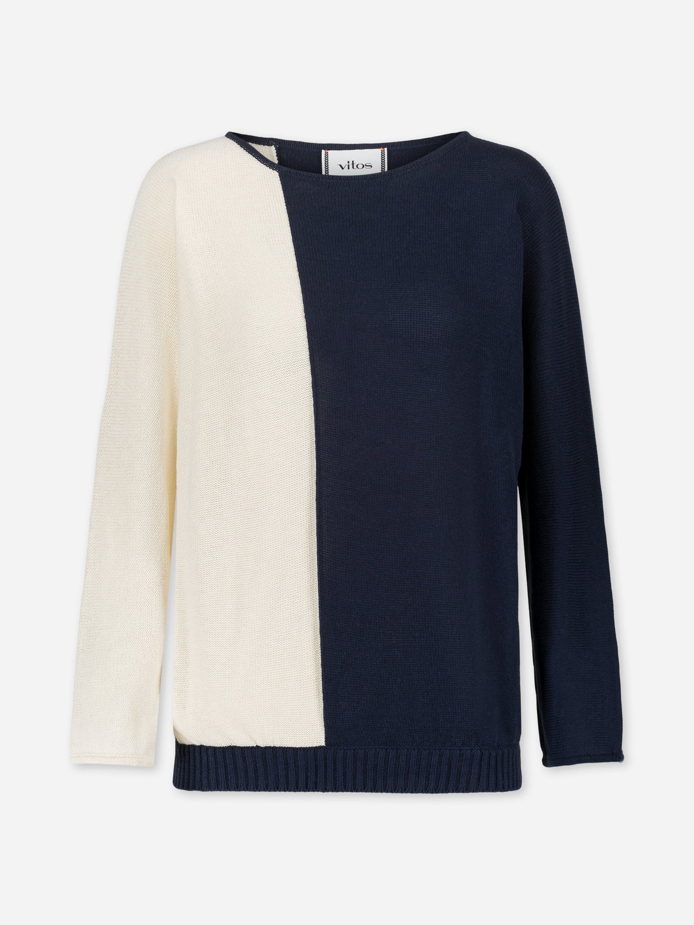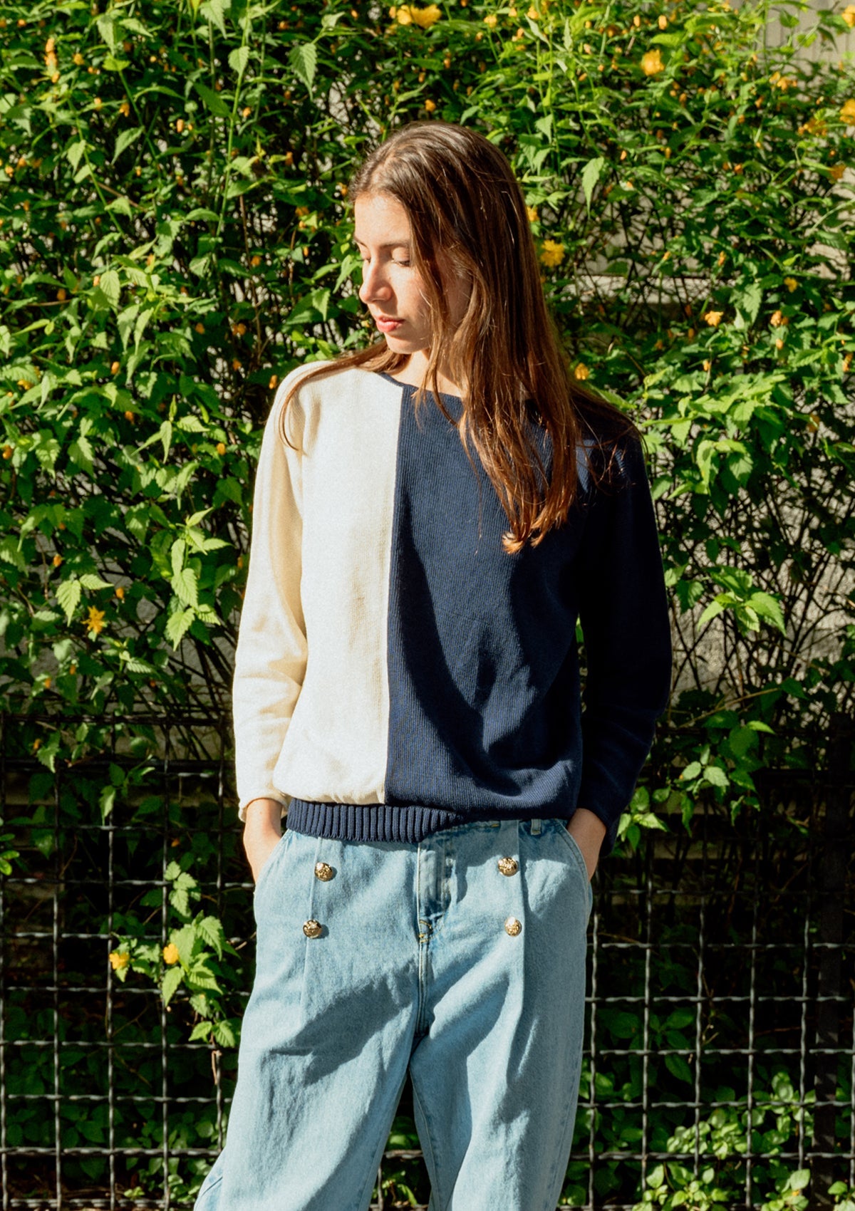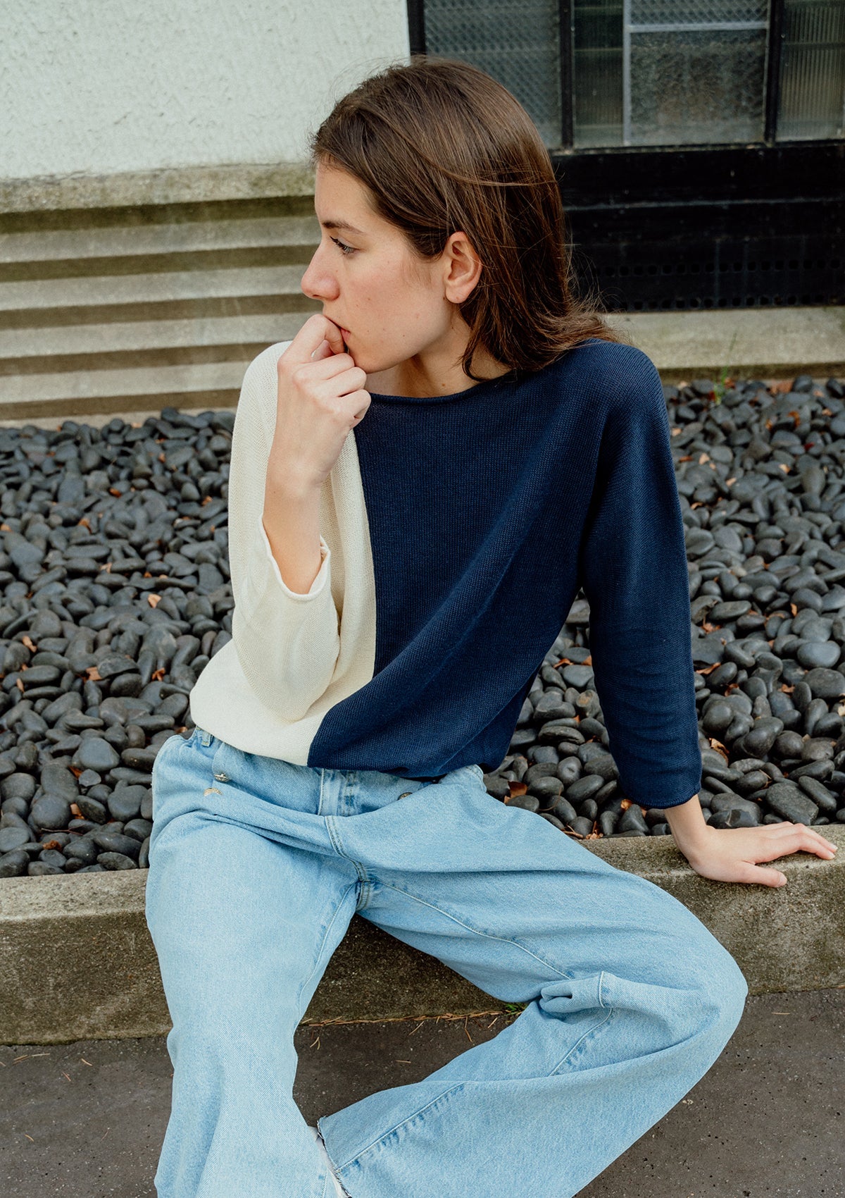 Colorblock sweater crafted in France with a mix knitting construction garter and jersey in pure and light cotton. Cropped sleeves and loose fit tightened at the waist by a thin rib.