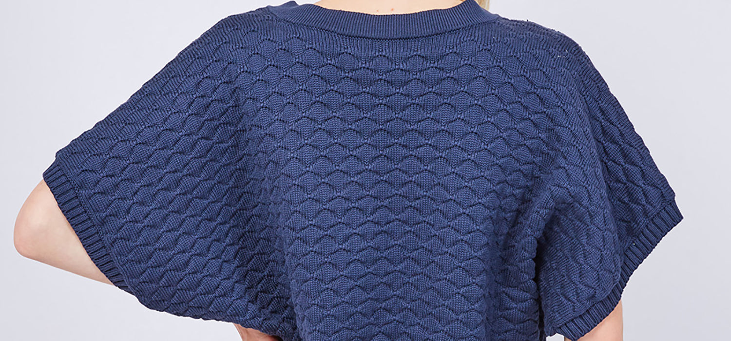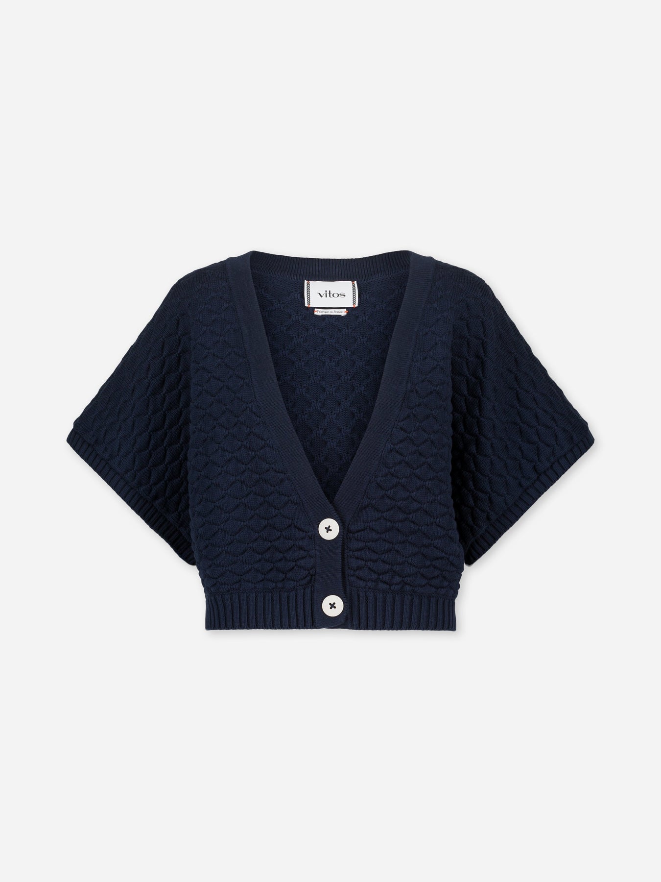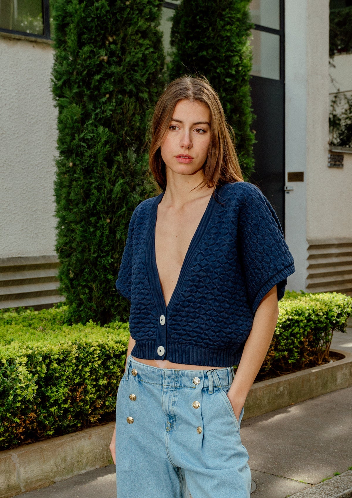 Cropped cardigan made in France from pure cotton in a textured knit finish. The 3/4 kimono sleeves create a nonchalant silhouette.