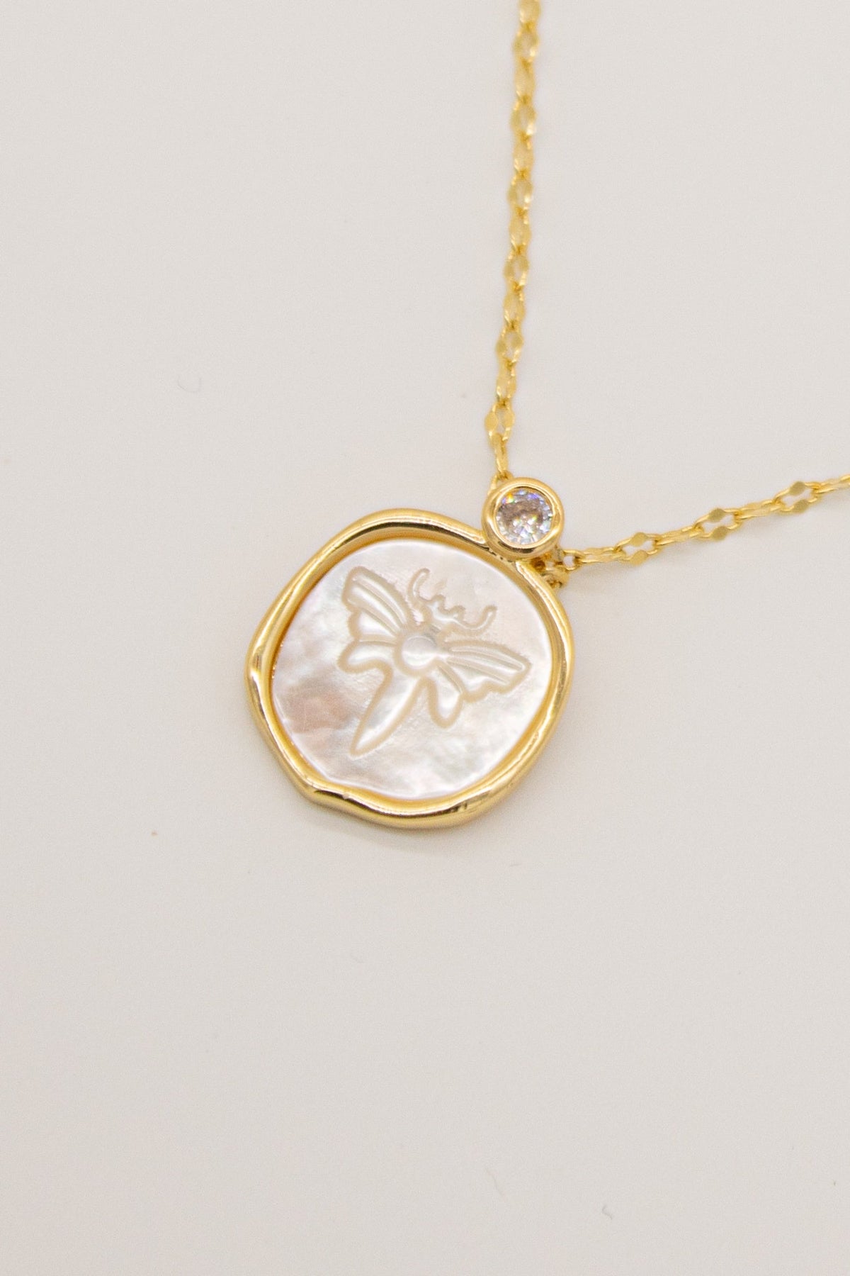 Handcrafted in Italy, this elegant necklace features a gold-plated pendant made of mother of pearl, engraved with a bee design. It is accented with a sparkling cubic zirconia stone and strung on a delicate 18K gold-plated chain. The necklace is designed to be waterproof, ensuring it retains its beauty even with daily wear.