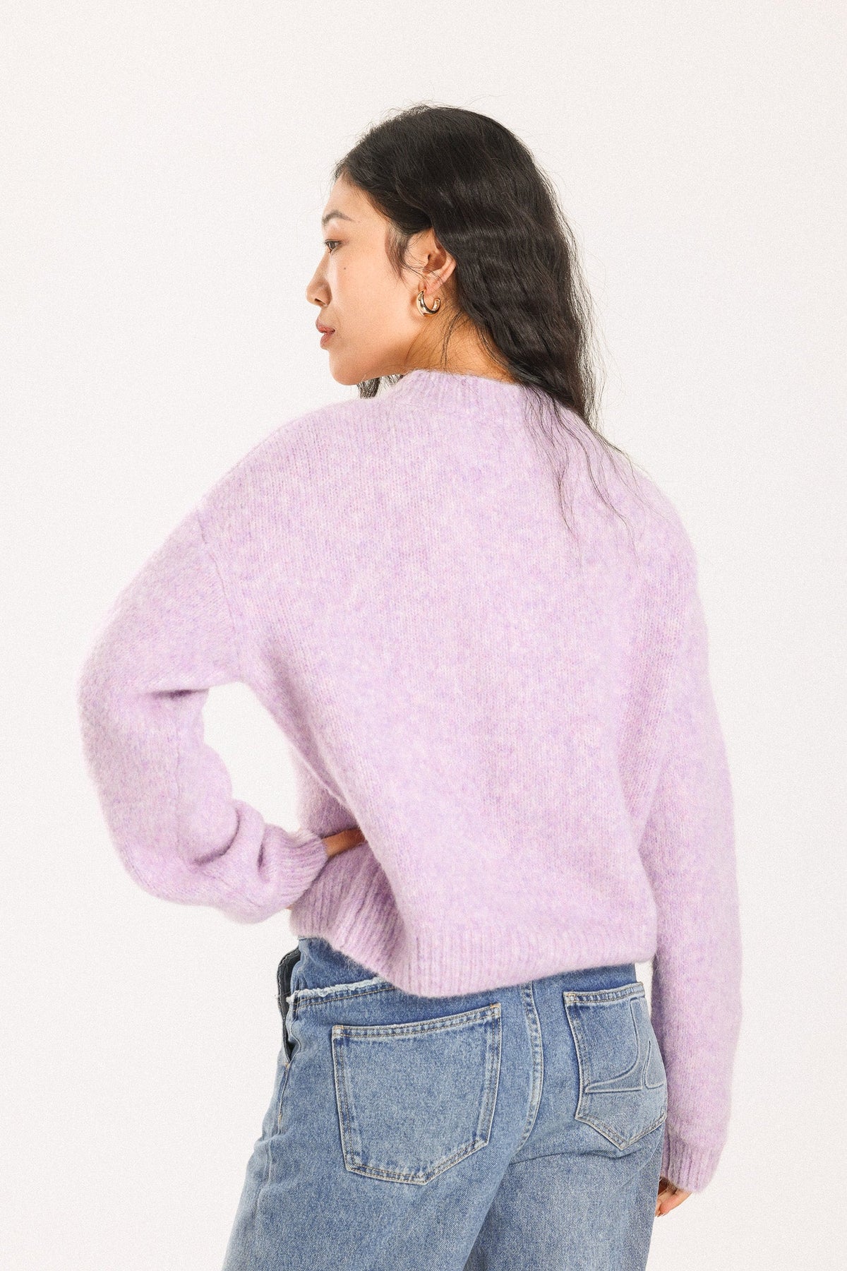 This delicate light purple sweater features a relaxed silhouette with a classic crew neckline, offering a soft and elegant pastel touch to your wardrobe.
