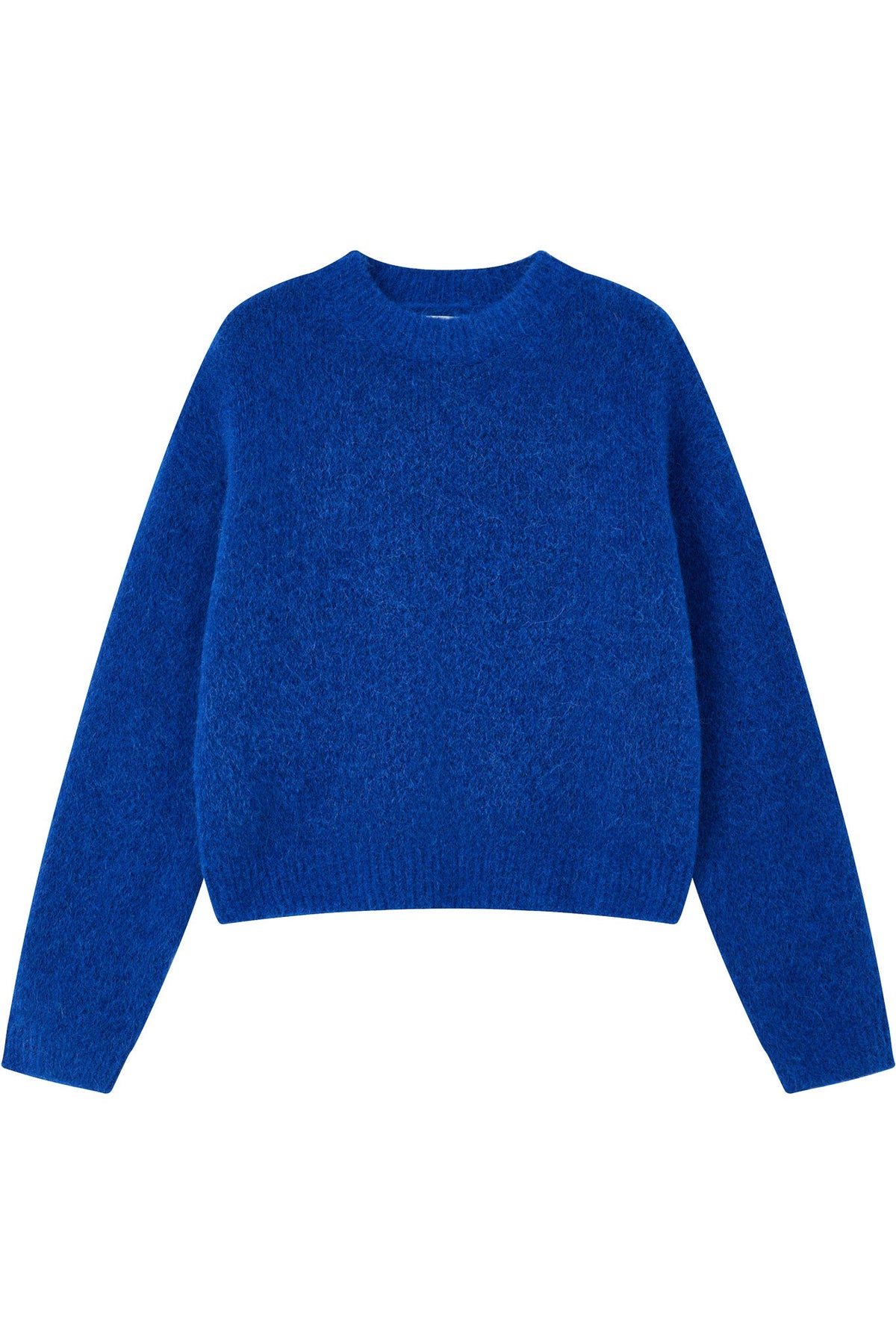 This striking royal blue sweater offers a relaxed silhouette with a classic crew neckline, making a bold yet timeless addition to any wardrobe.
