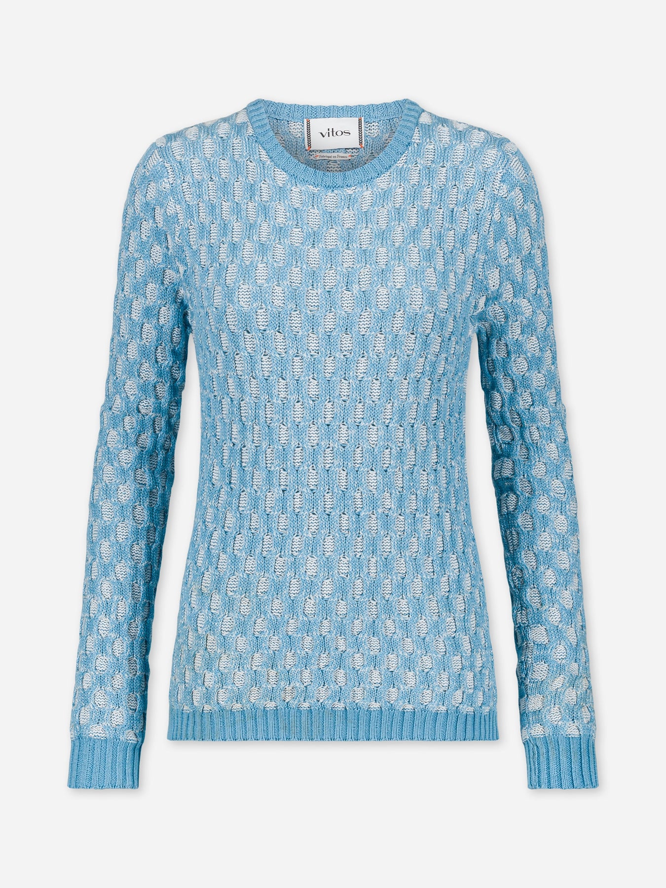 Our classic cable knit sweater featuring the brand's 70’s knitting pattern. Made in France with 2 colors threads for getting a fresh summer look and to shake up your wardrobe.
